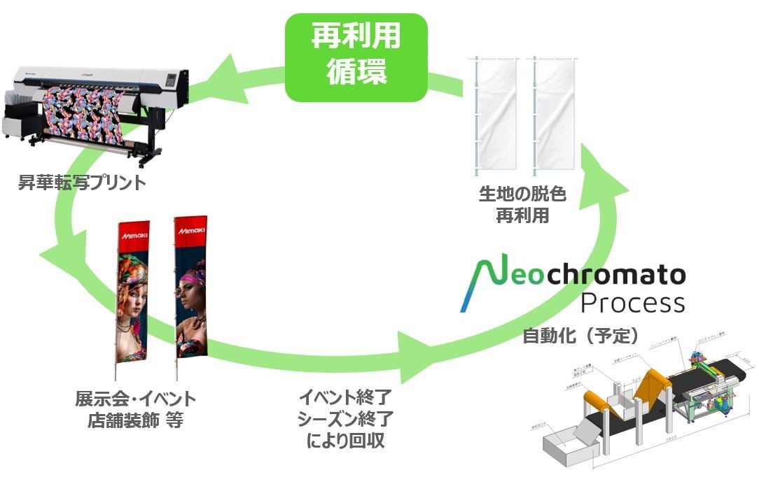 当社はネオクロマトプロセスを活用した実用条件とソリューションの製品化に取り組んでゆき、今後リテールブランド様(店舗サイン生地の再利用目的)及びアパレルブランド様(衣類生地の再利用目的)とのコミュニケーションからこの技術の可能性を検証していく次第です。