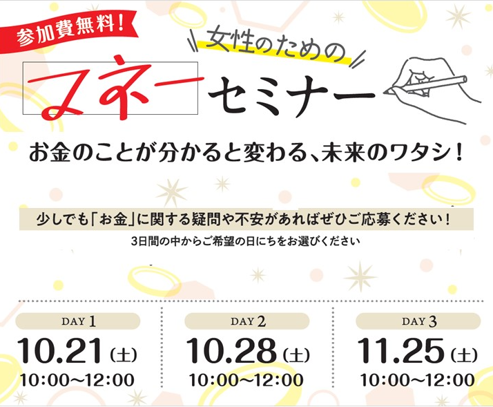 お金のことが分かると変わる、未来のワタシ!「女性のためのマネーセミナー」を10月・11月に開催!