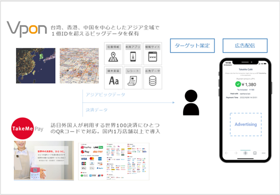 ビッグデータを活用したデジタルマーケティング支援をアジア全域で展開するVpon JAPAN株式会社(以下、Vpon社)とグローバルマルチ決済「TakeMe Pay」を提供するTakeMe株式会社は、Vpon社が保有するアジア圏1億IDをもとにしたビッグデータとTakeMe 社の決済後画面および決済データを連携させた新たなデータソリューションの開発を開始する事をお知らせ致します。