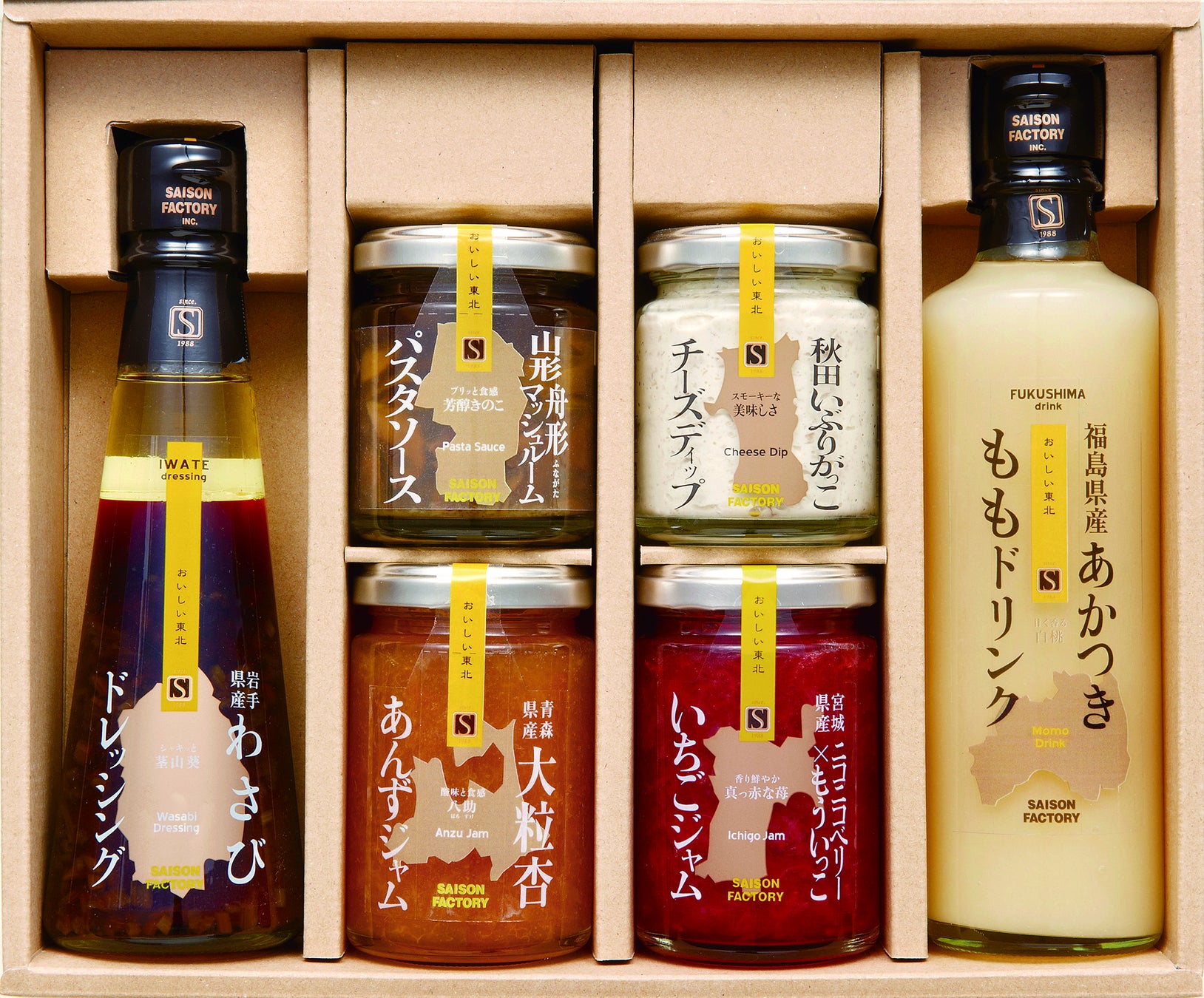 ギフト内容 岩手わさびドレッシング160ml、山形きのこパスタソース85g、秋田いぶりがっこチーズディップ85g、ジャム(青森あんず130g、宮城いちご125g)、福島ももドリンク275g