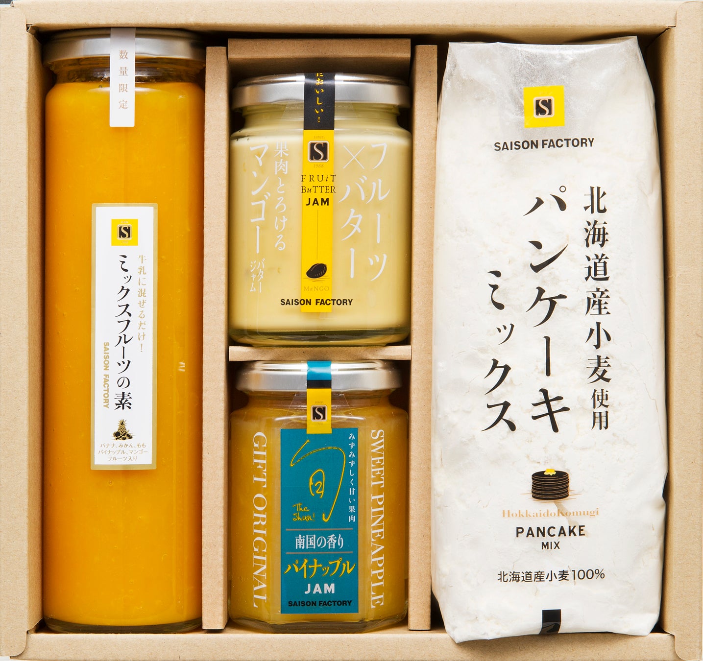 ギフト内容 ミックスフルーツの素350g、マンゴーバター140g、パイナップルジャム135g、パンケーキミックス500g