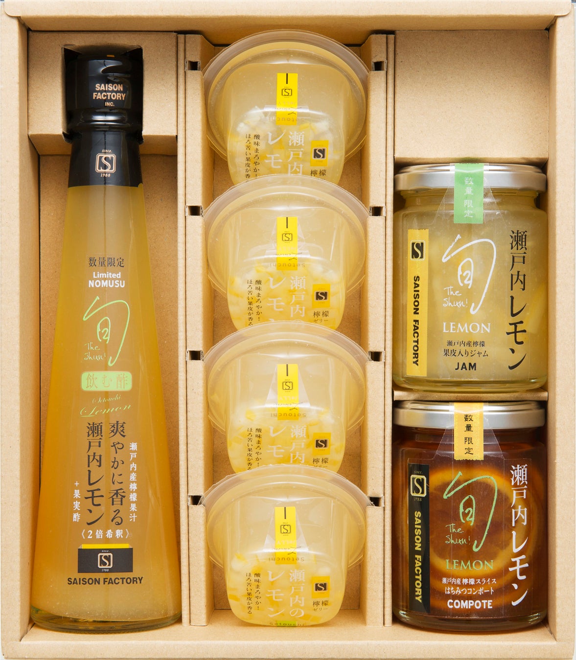 ギフト内容 飲む酢瀬戸内レモン200ml、瀬戸内レモンコンポート165g、瀬戸内レモンジャム150g、瀬戸内レモンゼリー68g×4