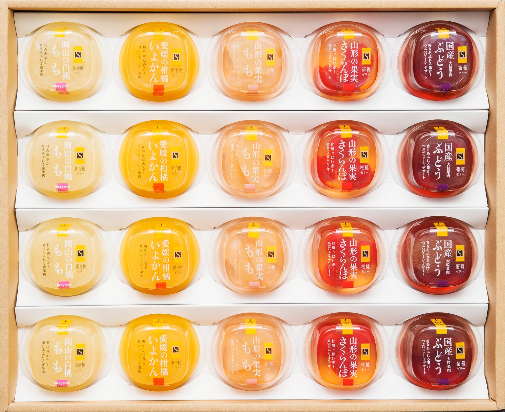 ギフト内容 ゼリー((岡山の白桃・山形のもも・山形のさくらんぼ・国産ぶどう)各70g×各4、愛媛いよかん68g×4)