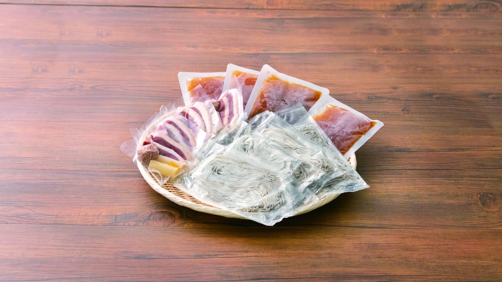 ギフト内容 冷凍なまそば130g、具材セット60g、鴨汁そばつゆ150g 各4食分