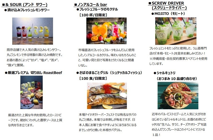 ビールが苦手な方・アルコールを飲まない方でも楽しめる、“レモンサワー”“カクテル”“モクテル(ノンアルコールカクテル)”などテーマ分けしたドリンクゾーンを設けました。各ドリンクと一緒に味わいたいフードも充実!