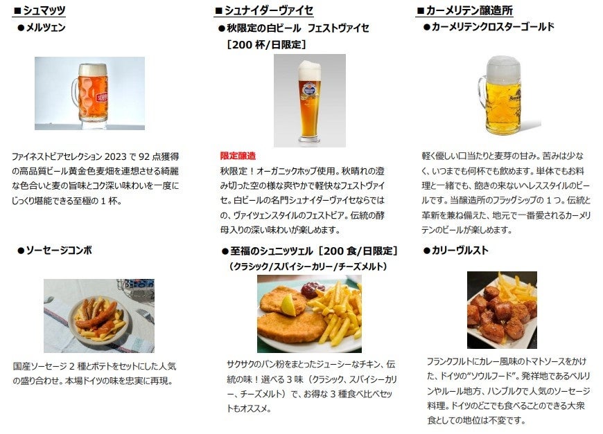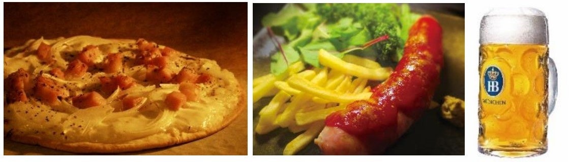 「ホフブロイ」の各種ビール等のご用意はもちろん、オクトーバーフェストのために年に一度製造される希少なフェストビアを贅沢に飲み放題で楽しめるプランも登場。また、フードでも本場の雰囲気を演出するため、ドイツ大使館公邸シェフの本格レシピでつくるドイツ発祥の薄焼きピザ「フラムクーヘン」や、特製ソースを使った「カリーヴルスト」を、本イベント用のレシピでご提供します。