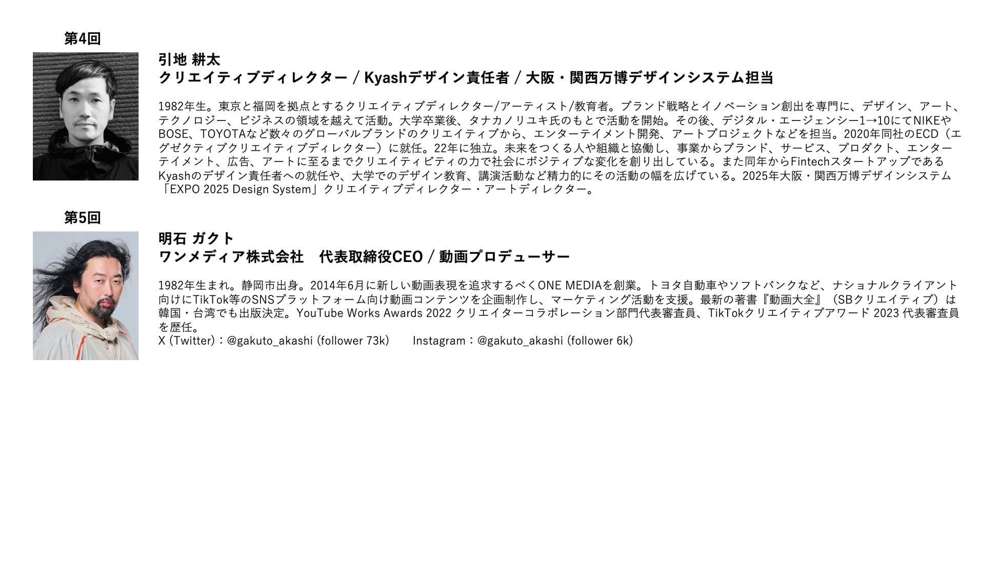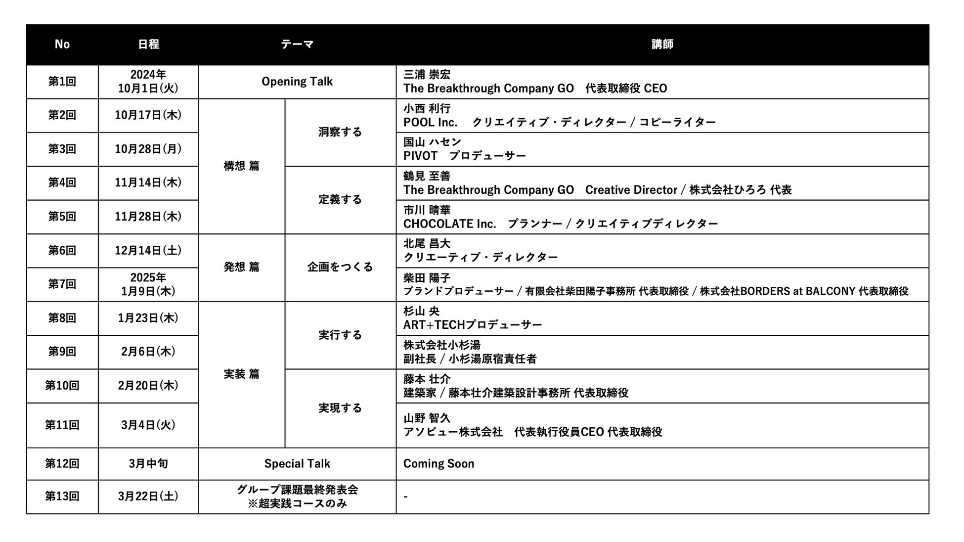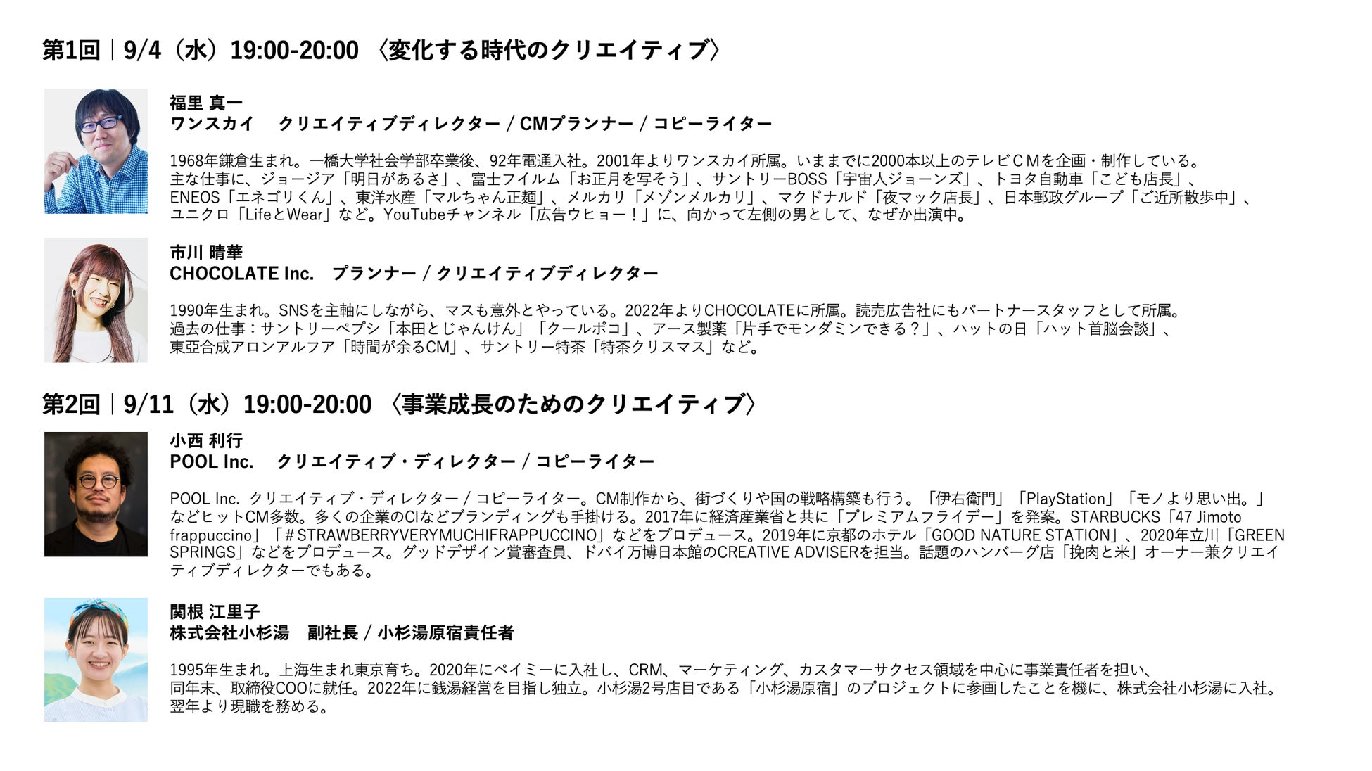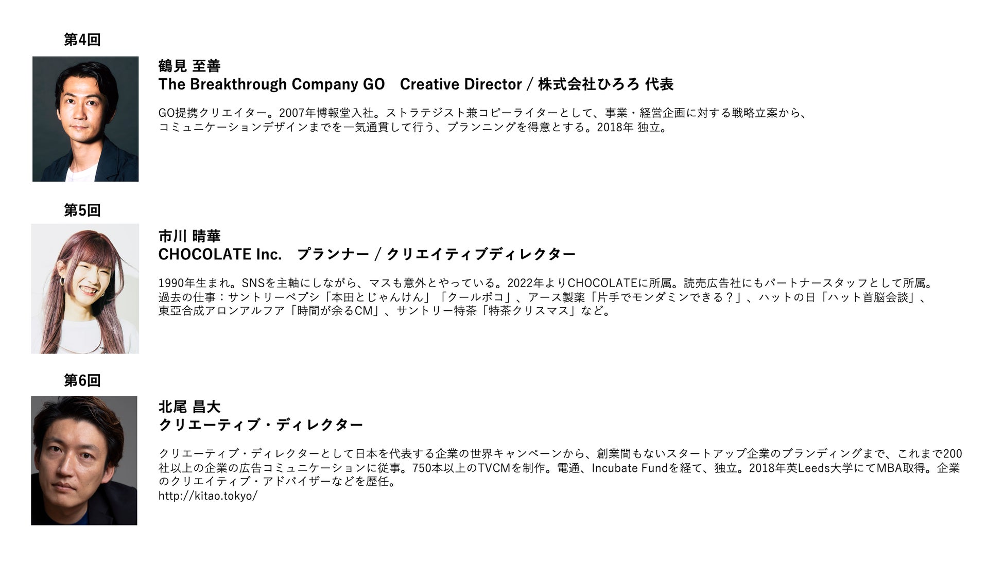 ※講師所属一覧:GO、POOL、PIVOT、CHOCOLATE、柴田陽子事務所、新領域、小杉湯、藤本壮介建築設計事務所、アソビュー、ワンスカイ、博報堂、サイバーエージェント、ワンメディア、プラップジャパン
