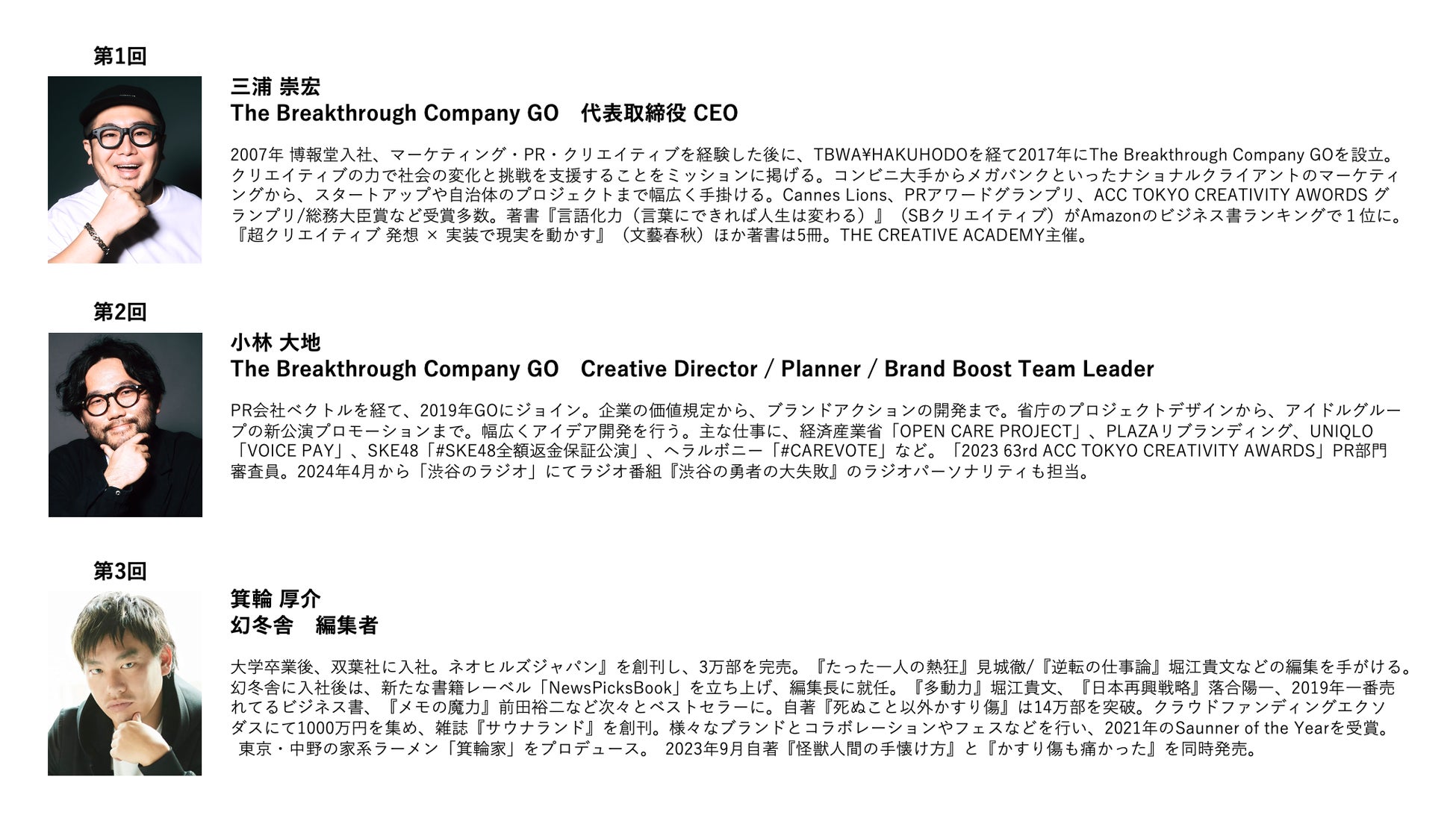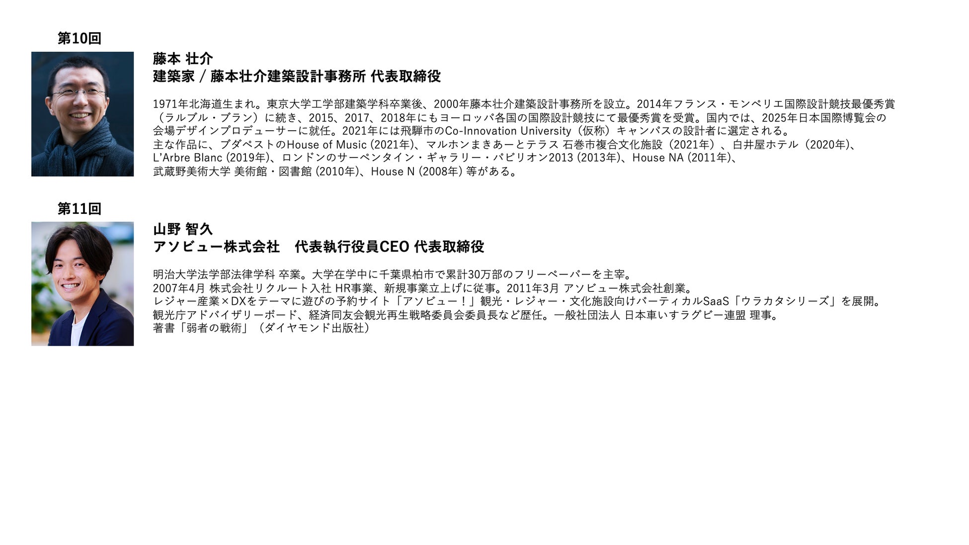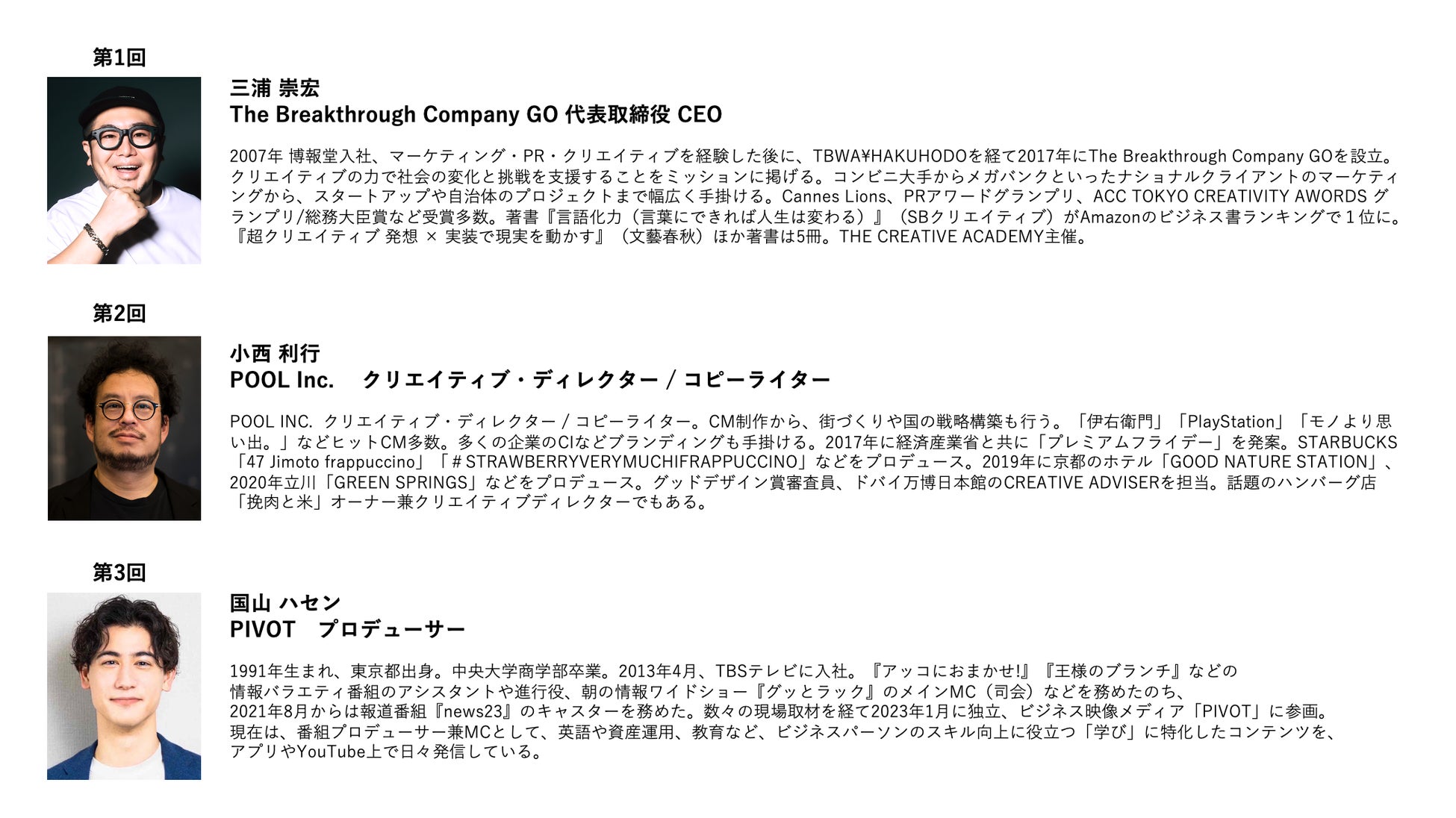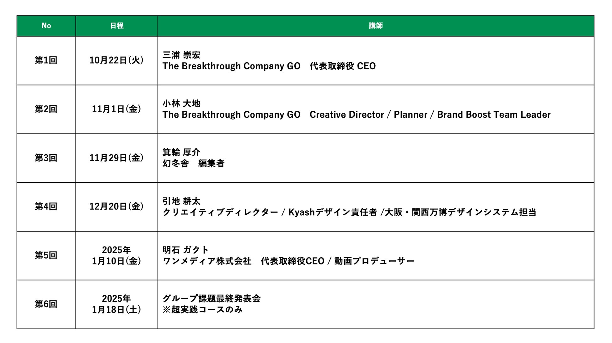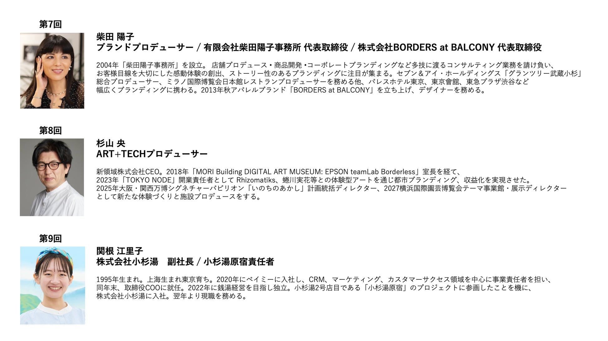 ※講師所属一覧:GO、POOL、PIVOT、CHOCOLATE、柴田陽子事務所、新領域、小杉湯、藤本壮介建築設計事務所、アソビュー、ワンスカイ、博報堂、サイバーエージェント、ワンメディア、プラップジャパン