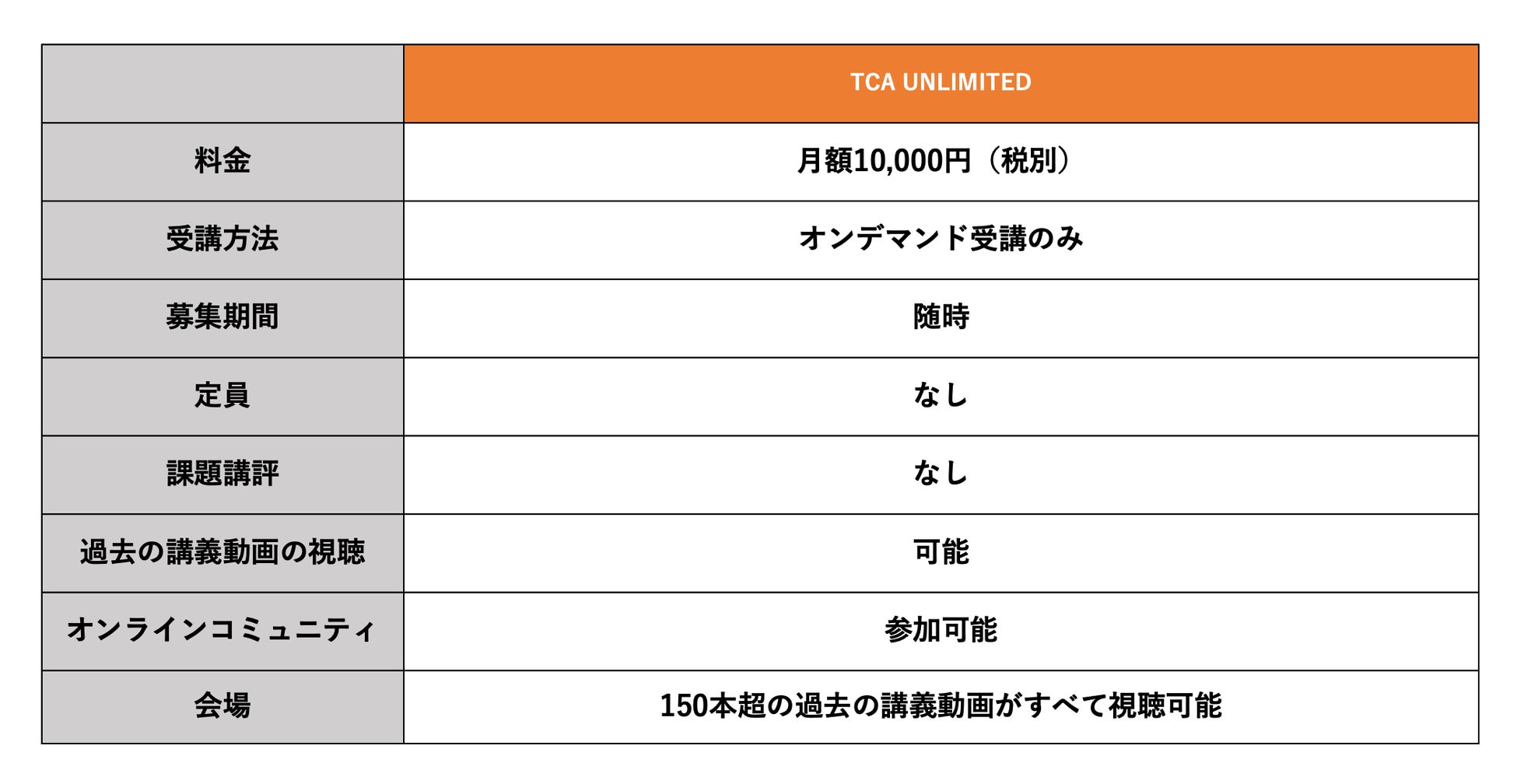 ④好きな時に好きなだけ学べる「TCA UNLIMITED」コース