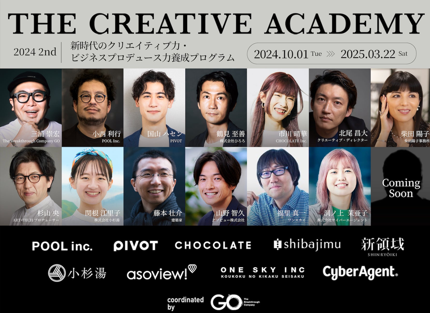 GOは「THE CREATIVE ACADEMY」の企画・運営を通して、日本のビジネスパーソンのクリエイティビティを高め、経済を活性化していくことにコミットしてまいります。