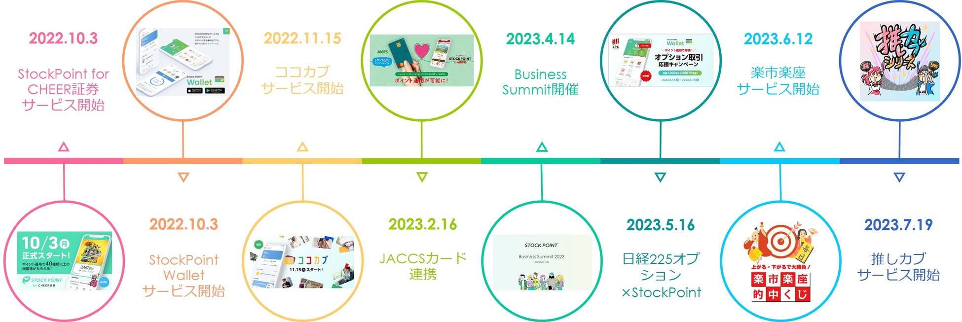 2017年、世界で唯一※の”株価とポイントが連動する”「StockPoint」サービスを開始以降、クレジットカードやポイント発行体企業との連携の他、「StockPoint for CONNECT」「STOCKPOINT for MUFG」といったポイント運用サービスの充実に力を入れてきましたが、7年目は、同じポイント運用でも共通ポイントを保有していなくても学びながら稼ぐ”Learn to Earn”体験の「StockPoint for CHEER証券」や、企業のお客様をロイヤルカスタマーからファン株主に育てていく「ココカブ」をリリース。