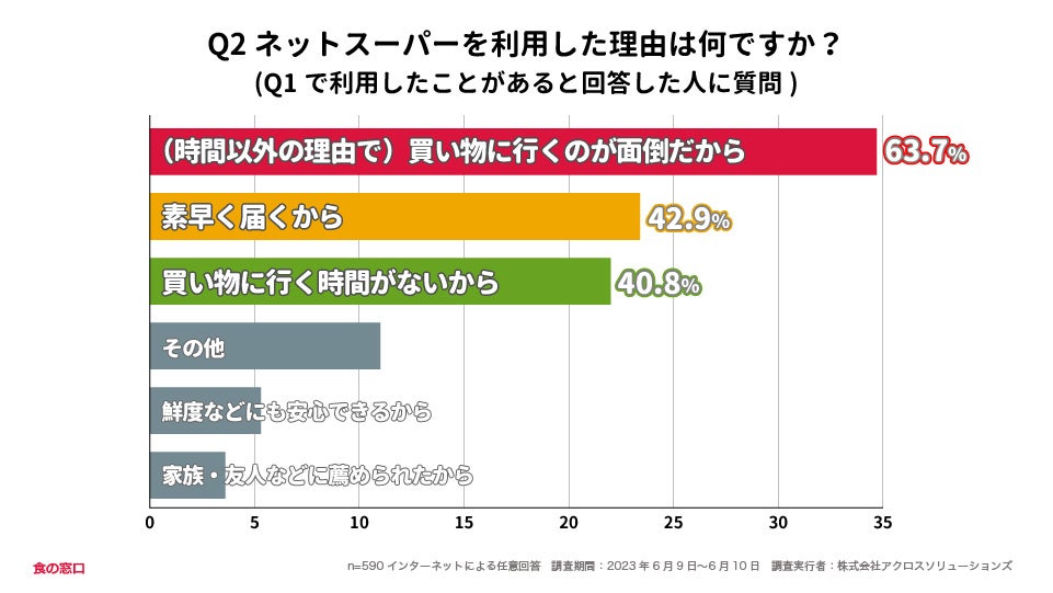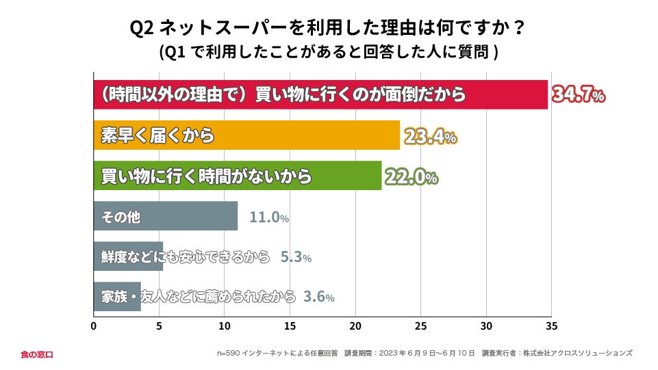 2番目以降には、「素早く届くから」(23.4%)、「買い物に行く時間がないから」(22%)と続き、手間や時間を省くためにネットスーパーを利用したという声が多いことが分かりました。