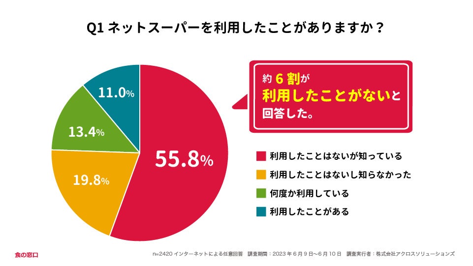 そこで、株式会社アクロスソリューションズと一般社団法人 日本唐揚協会が共同運営している食の窓口(URL:https://karaage.ne.jp/contents/ )は、20歳〜60歳以上の男女2420人を対象に「ネットスーパーについての意識に関するアンケート調査」を実施しました。