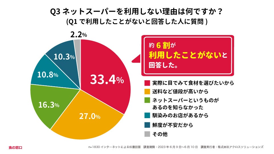 ネットスーパーの利用未経験者のうち、最も多かった回答は「実際に目でみて食材を選びたいから」で33.4%でした。