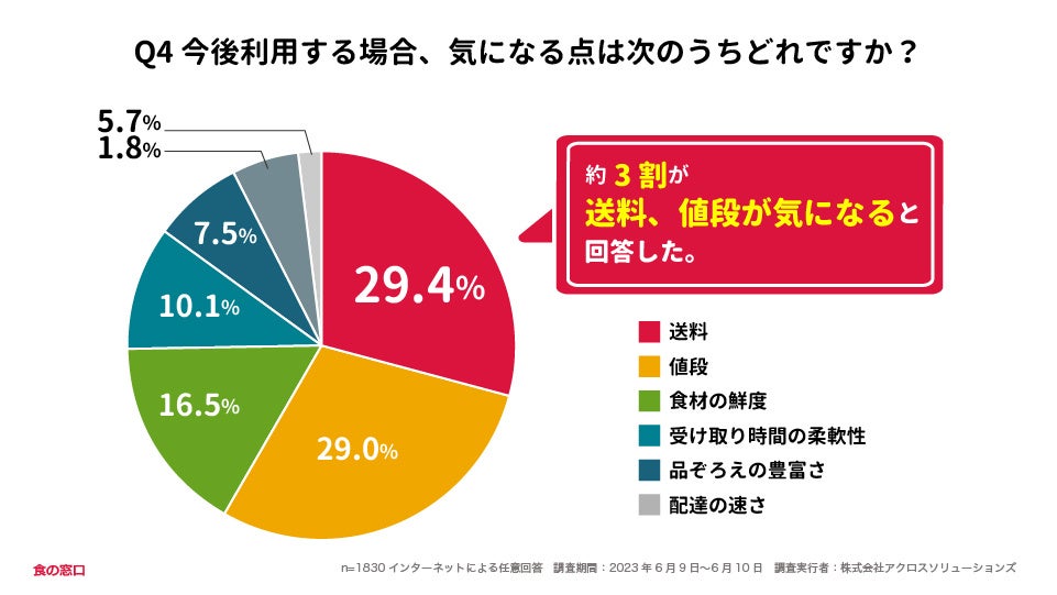 今後の利用の際に気になる点として、「送料」と答えた人が29.4%、「値段」と答えた人が29%と、料金に関する項目2つが高い割合を示しました。