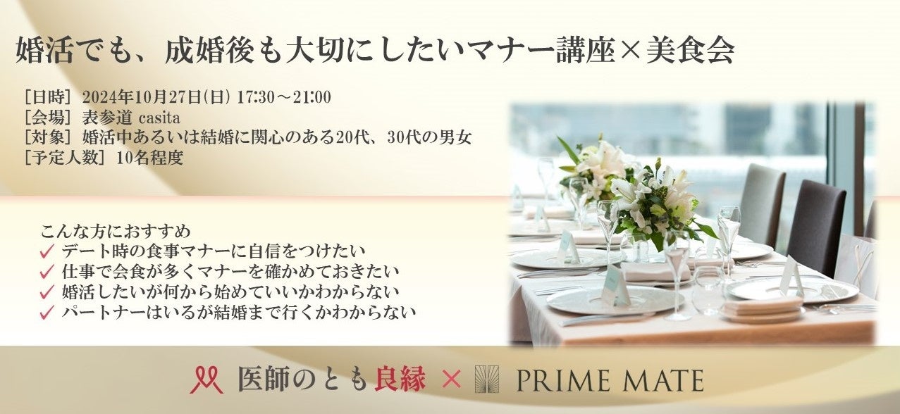 婚活でも、成婚後も大切にしたい"マナー講座×美食会"を10月27日開催!【医師のとも 良縁】×【PRIME MATE】ハイクラス結婚相談所コラボイベント実施!