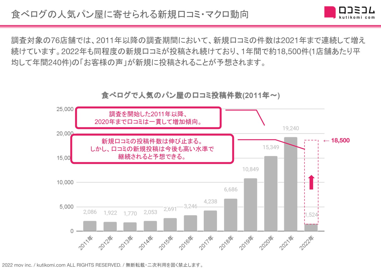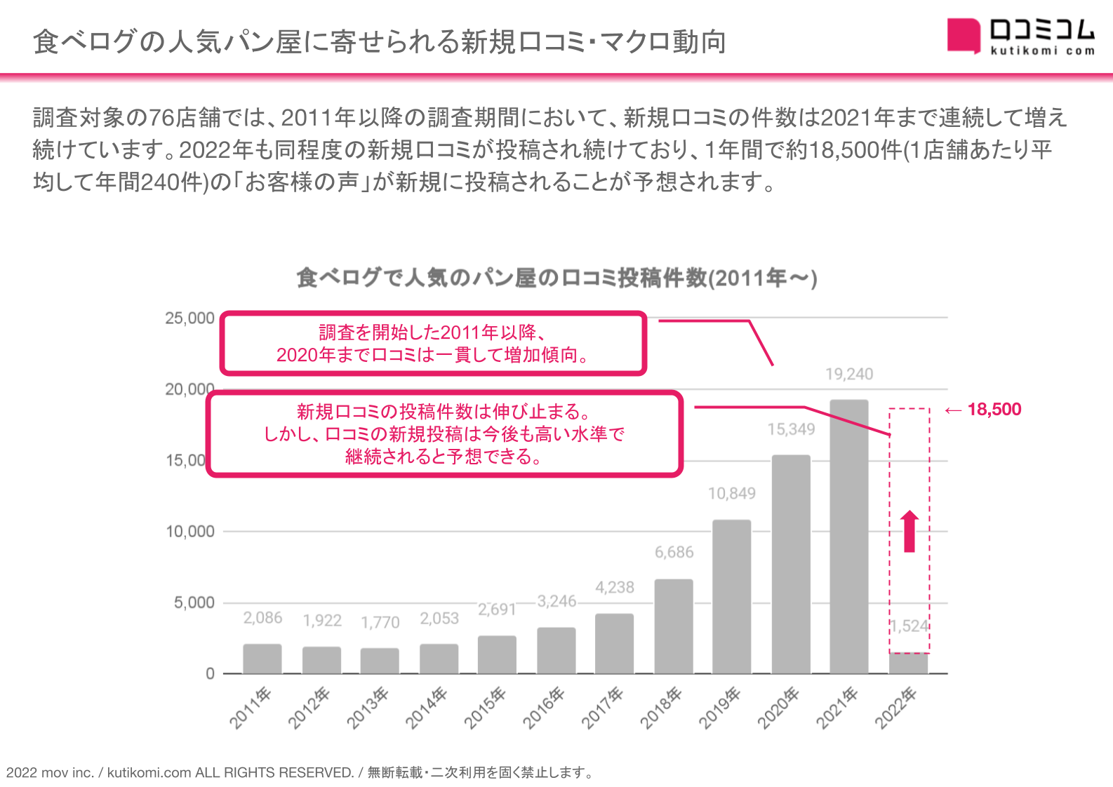 2022年は、1年間で約18,500件、1店舗当たり平均年間240件の口コミが寄せられると予想されます。