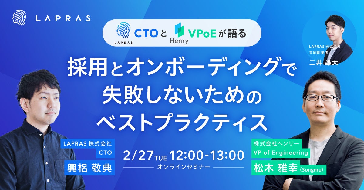 LAPRAS株式会社(所在地:東京都品川区、代表取締役:染谷健太郎 以下、LAPRAS社)は、株式会社ヘンリーと共催で「エンジニア採用とオンボーディングで失敗しないためのベストプラクティス」についてのウェビナーを2月27日に開催します。