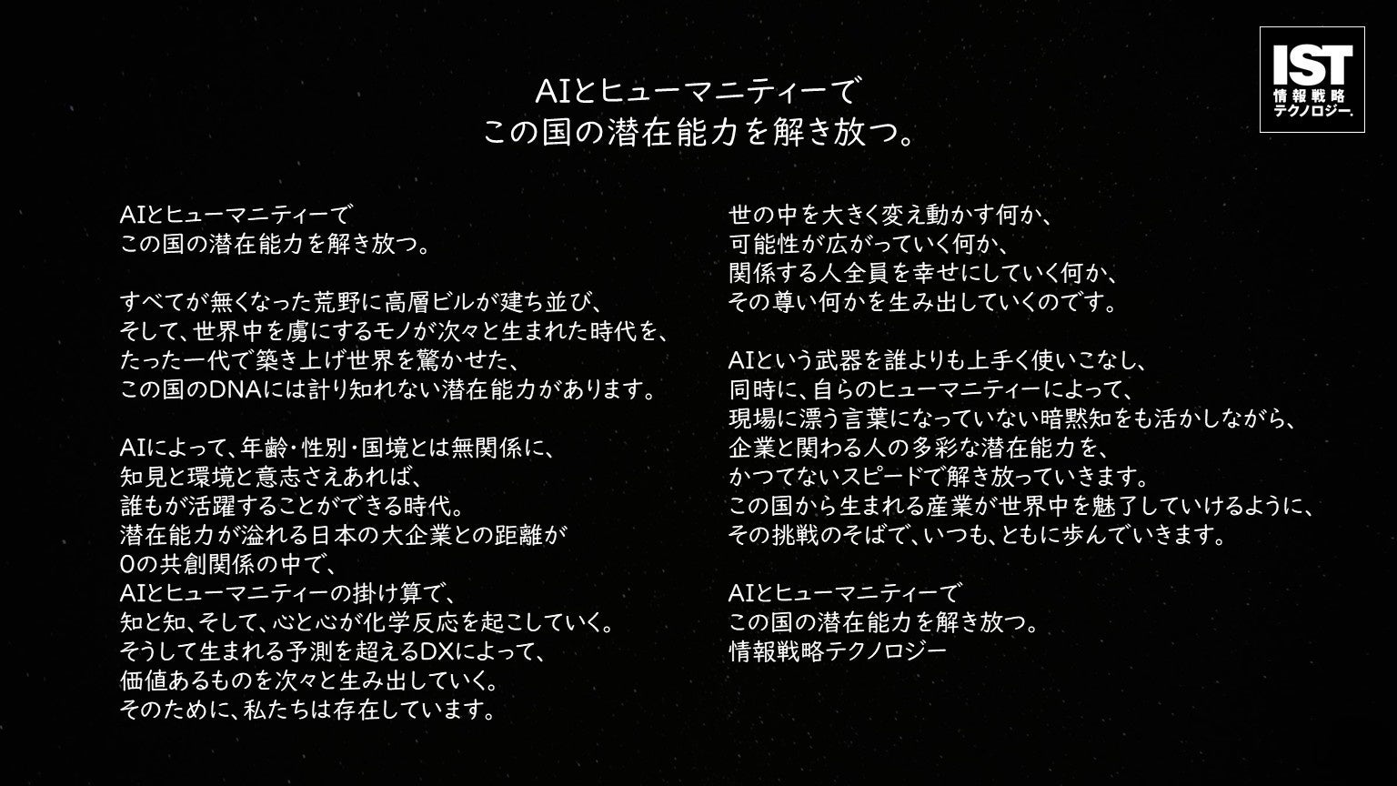 株式会社情報戦略テクノロジー(東京都渋谷区、代表取締役社長 髙井淳、以下「当社」)は、2026年4月2日にコーポレートサイトを全面リニューアルいたしました。本リニューアルに合わせ、AI時代における当社の新たな使命を込めた新PHILOSOPHY「AIとヒューマニティーでこの国の潜在能力を解き放つ。」を策定いたしました。また、システム開発業界の多重下請け構造を破壊し、本来あるべき姿を創り上げてきた当社の軌跡と、これからの日本の明るい未来に向けた挑戦を語る「経営幹部9名の特別インタビュー」を同時公開いたします。