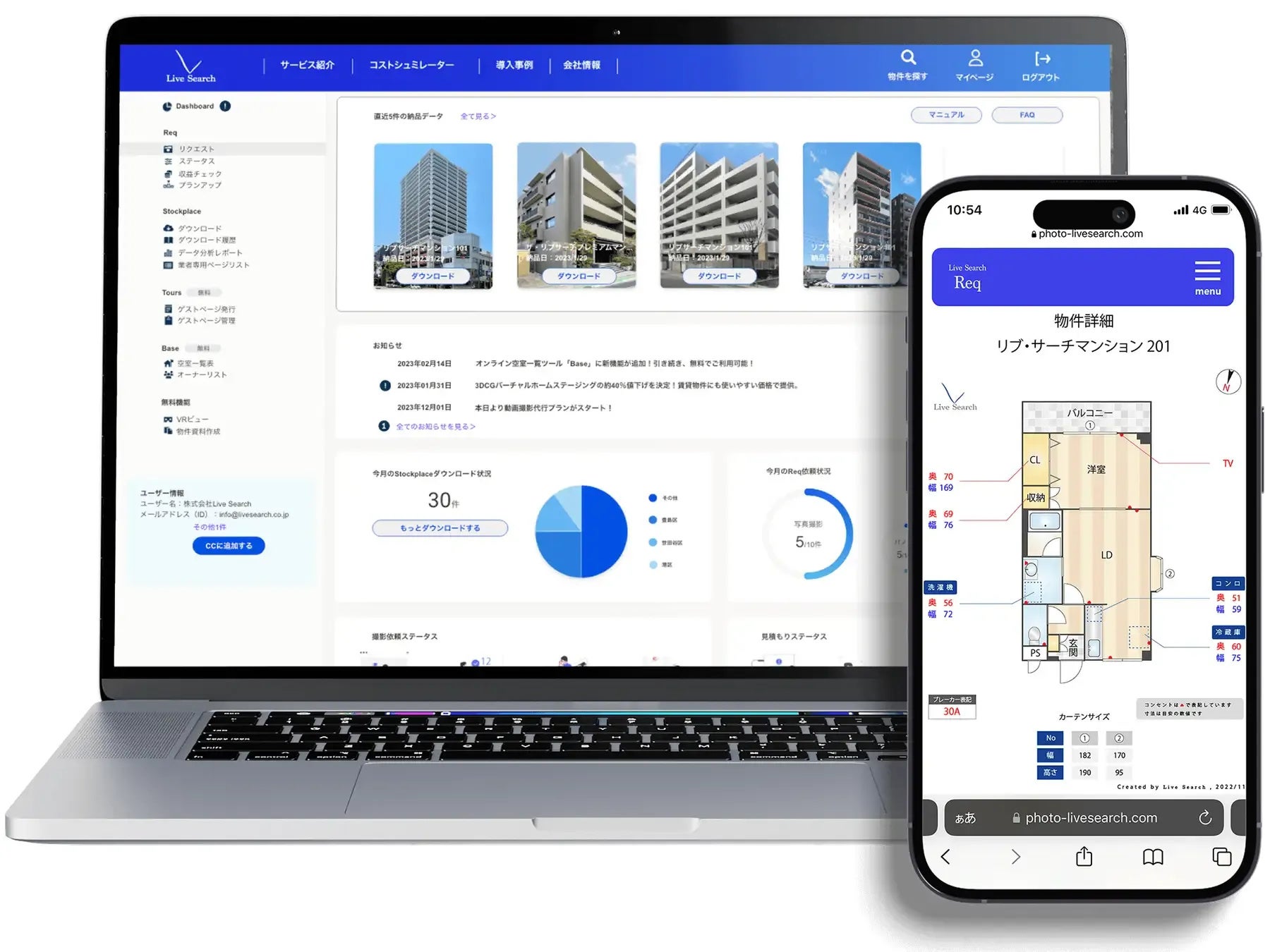 不動産物件を対象とした撮影・間取り図作成等をPCからいつでも依頼でき、撮影依頼からデータの納品、撮影状況の進捗管理などをワンストップで一元管理できるクラウドサービスです。提供するコンテンツは、物件写真・間取り図・パノラマVR写真・ルームツアー動画・3DCGバーチャルホームステージングなど多岐に渡り、間取り図は業界初となる室内のカーテンサイズやコンセントの位置等の詳細情報を記載しており、よりお部屋探しのエンドユーザー目線を意識した作りとなっています。これらの高いクオリティのデータによって、業界平均よりも空室期間が平均で60日短縮(※1)される仕組みを不動産会社様に提供しております。