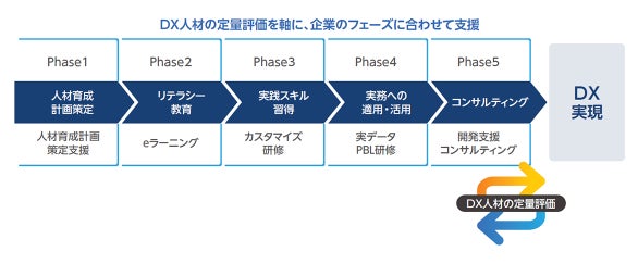 キカガクでは、企業のミッションやビジョンに基づいた必要なDX人材の定義から、育成計画の策定、eラーニング、カスタマイズ研修、課題解決型研修(PBL)までを一気通貫でサポートしています。DX人材育成における全てのフェーズを支援できるため、企業のDX進捗フェーズに合わせて導入いただくことができます。