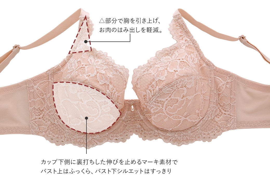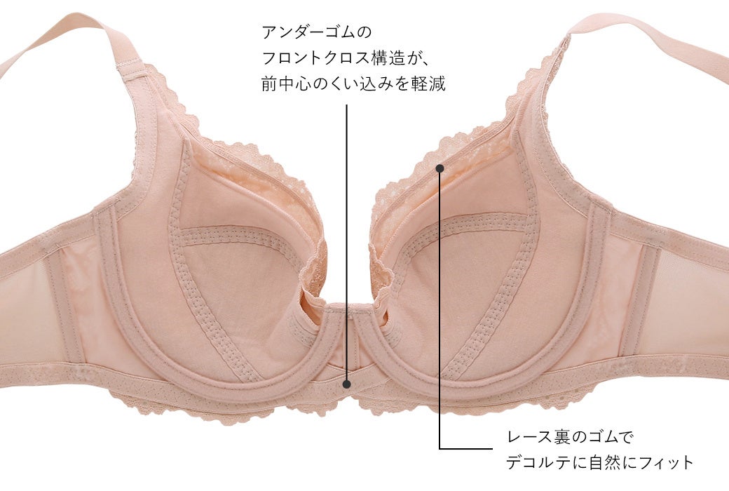 カップ下部分は引続き伸びないマーキ素材の裏打ちで、バストの下垂やたわみを補正し美しいバストラインを演出。サイドの脇の高さもそのままに、スッキリとしたサイドシルエットをつくります。フロント中心部分のアンダーゴムをクロス構造にアップデートすることで、ワイヤー中心先端部の肌への当たりを軽減しさらに心地良いフィット感へ。