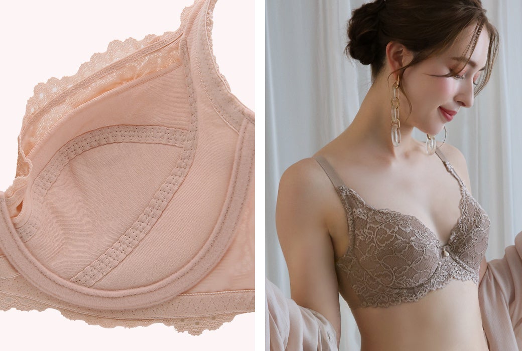 バストの全体を覆ったブラジャー。バストを覆う面積が広く、バスト全体をしっかり持ち上げて安定させます。安定感があるので、豊かなバストや柔らかいバスト、下垂が気になる方にも合いやすいタイプです。
