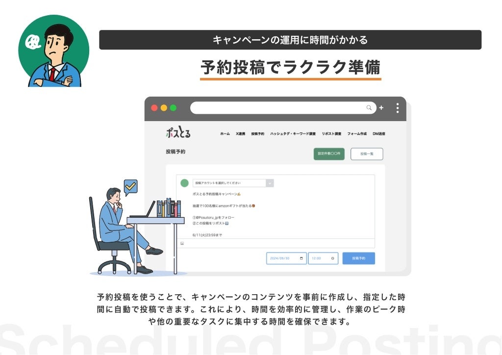 予約投稿を使うことで、キャンペーンのコンテンツを事前に作成し、指定した時間に自動で投稿できます。これにより、時間を効率的に管理し、作業のピーク時や他の重要なタスクに集中する時間を確保できます。