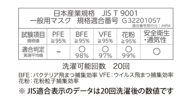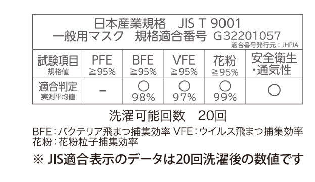 『COOLMAX21』は、繰り返し洗って使用できる布製マスクながら、「JIS T9001」の適合審査を通過し、適合番号を取得しております。
