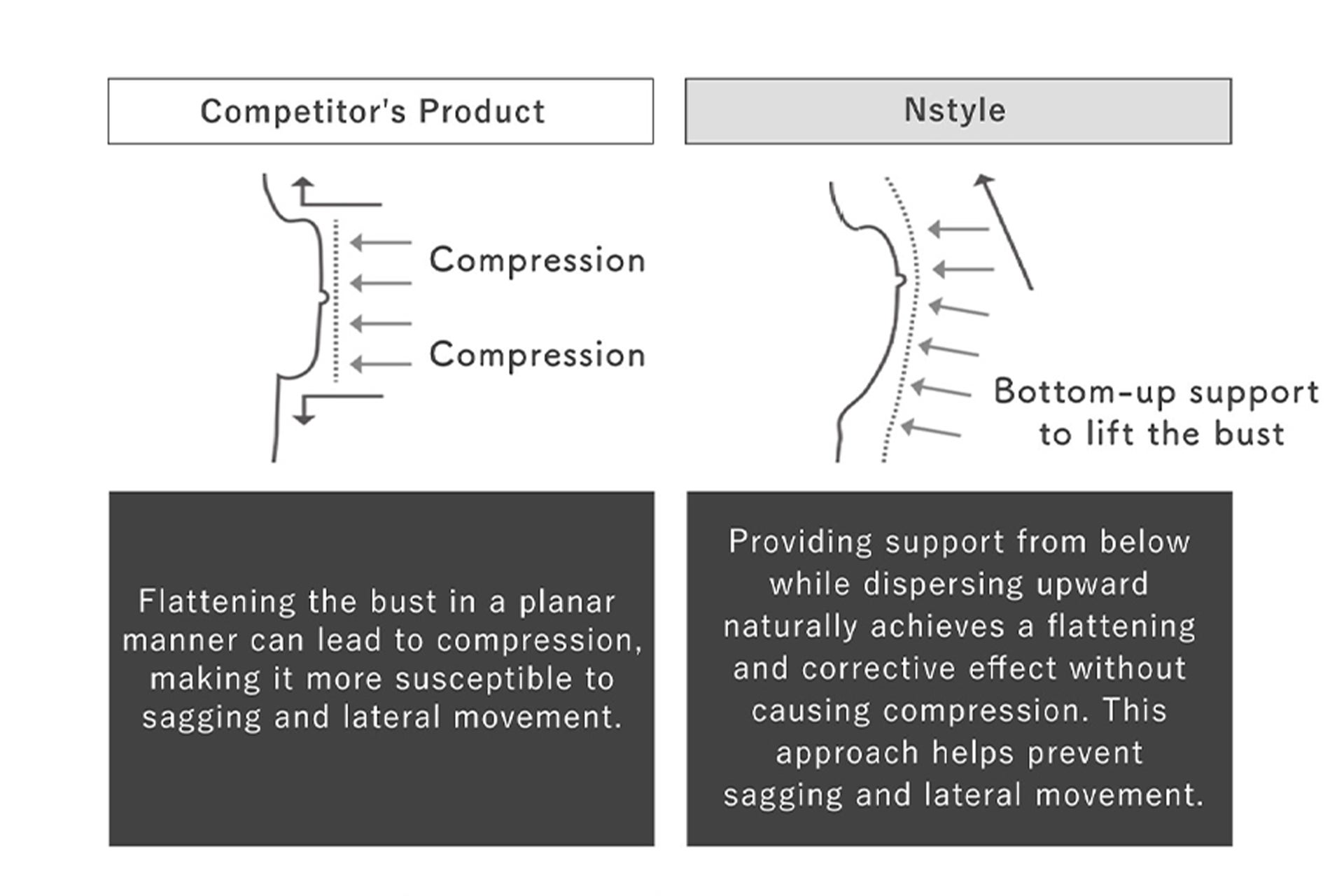 ファッションやジェンダーアイデンティティの多様化に対する理解が進みつつある現代でも、『胸は大きく、美しく、形よく見せてこそ!』という価値観はいまだに根強く残っています。無条件に社会から“女性らしさ”を求められる中で、埋もれがちだった『バストをコンパクトに、小さくみせたい』というお客様の声に応えたい、そんな想いからNstyleの企画開発がスタートしました。