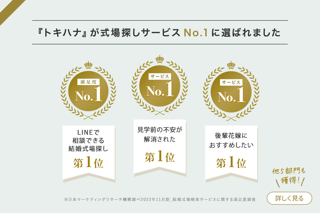 元ウエディングプランナーに22時まで何でも相談できます。結婚情報誌ではわからないリアルな見積もりや評判を知ることができ、こだわりを伝えたり様々な診断を通してピッタリの式場が手軽に見つかります。提携式場が厳選されていて、営業重視の式場はサービス対象外だから安心。トキハナからブライダルフェア予約をすると即決不要の最低価格保証・持込み自由・見積もりチェックなどのサービスが受けられ、よくある式場選びの失敗も回避できます。