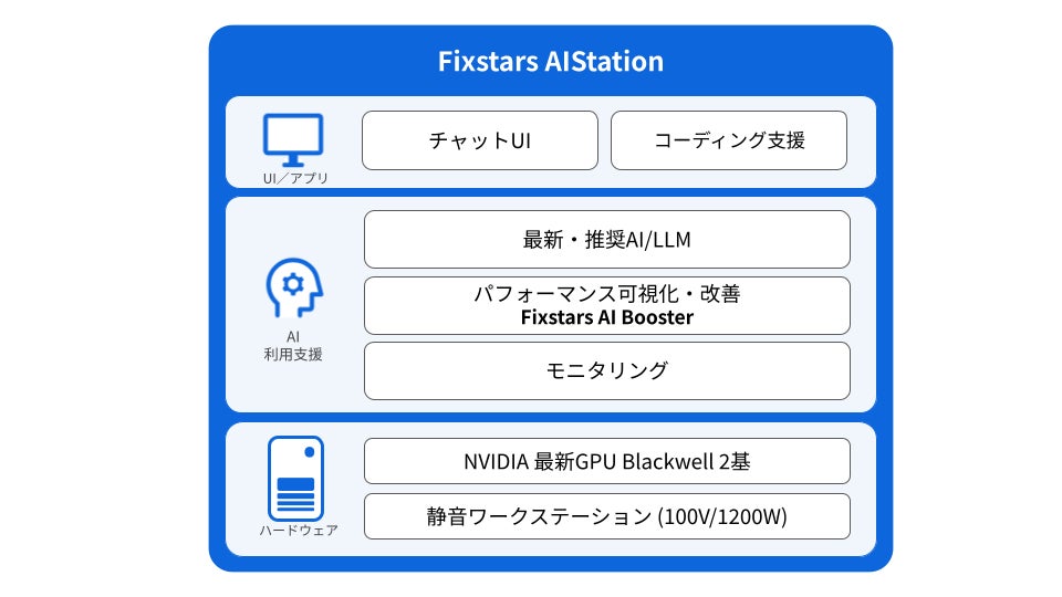パフォーマンスエンジニアリング技術のリーディングカンパニーである株式会社フィックスターズ(東証プライム:3687、代表取締役社長 CEO:三木 聡)は、最新AIをローカル環境でセキュアに使えるプライベートAI活用ワークステーション「Fixstars AIStation(エーアイ・ステーション)」(以下、AIStation)のレンタル提供を開始しました。