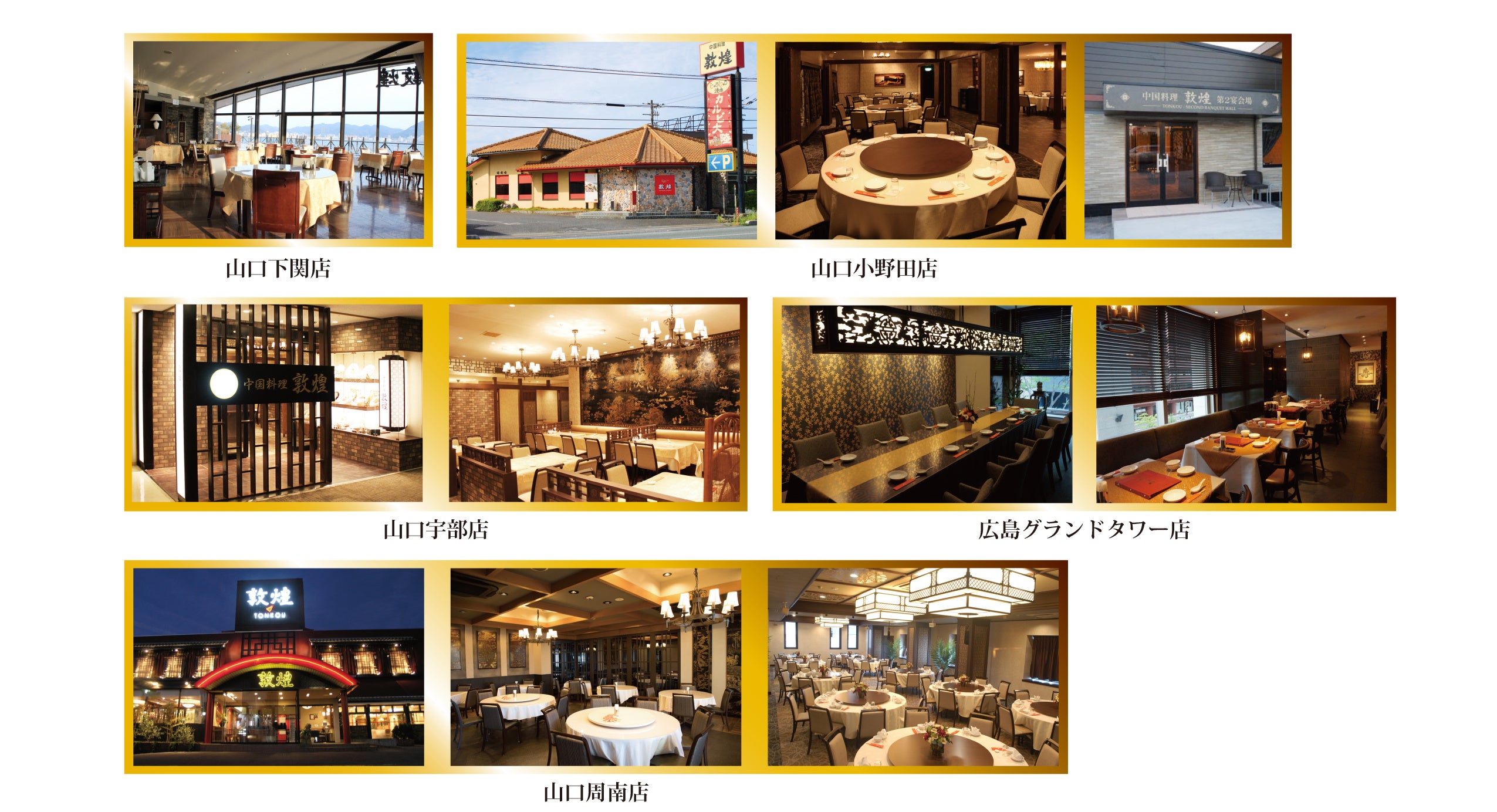 1974年(昭和49年)11月創業、本格中国料理店として山口県小野田市(現山陽小野田市)に1号店をスタートしました。本格的な中国料理が地方ではあまりない時代から、四川料理をメインとするレストランを山口県を中心に展開してきました。当時は辛いイメージの四川料理はお客様になじめず苦戦しましたが、徐々にお客様にも浸透し、今では山口県を代表する中国料理レストランとして支持を受けております。各店舗において、大型宴会場や個室を完備しており、普段使いは勿論のこと、ハレの日でのご利用や、宴会等様々なシーンでご利用いただけます。敦煌は地元に根付いた中国料理レストランです。地産地消の取り組みや地元生産者との繋がりを深め、「食」のリーディングレストランとしてこれからも進化し続けてまいります。