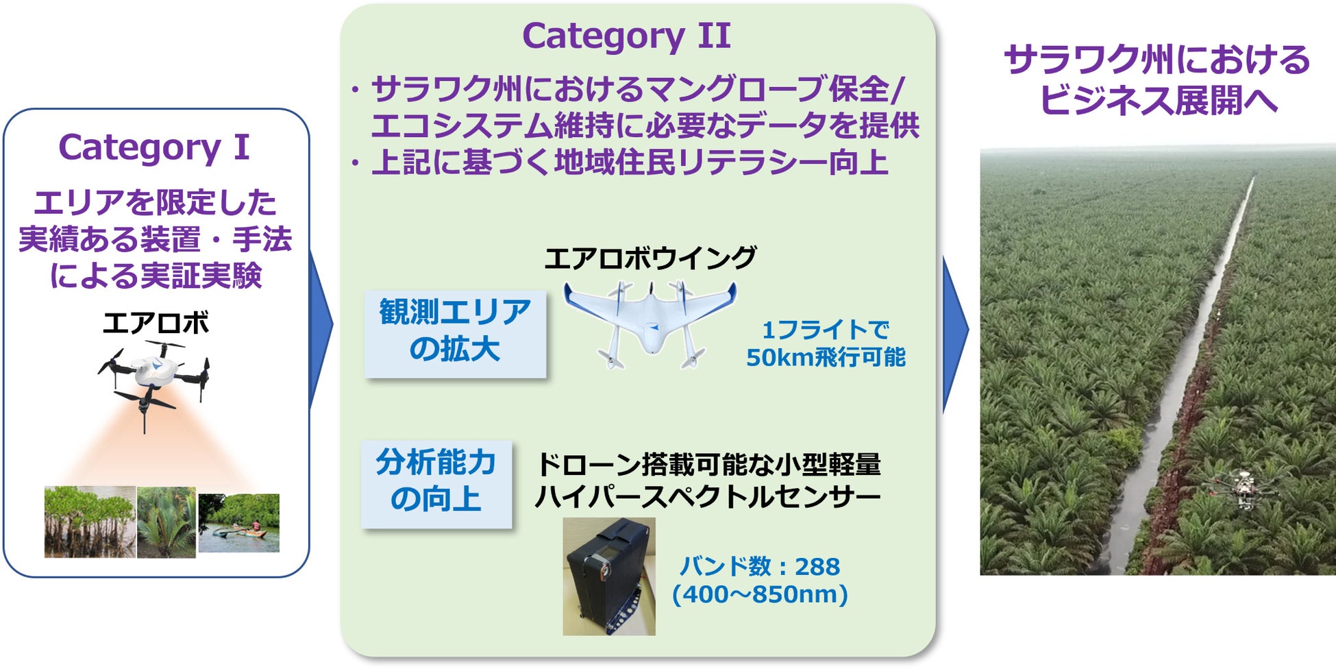 本格的な事業化実証(Category II)のフェーズでは、エアロセンスの広域対応ドローン(エアロボウイング)により観測エリアを広げ、ファンリードのハイパースペクトルセンサー搭載により分析能力を向上させます。ファンリードとエアロセンスは、政府機関や地域コミュニティー等に対し、マングローブの保全及び生態系の維持に必要なデータの提供を続けることで、サラワク州におけるビジネス展開を目指します。