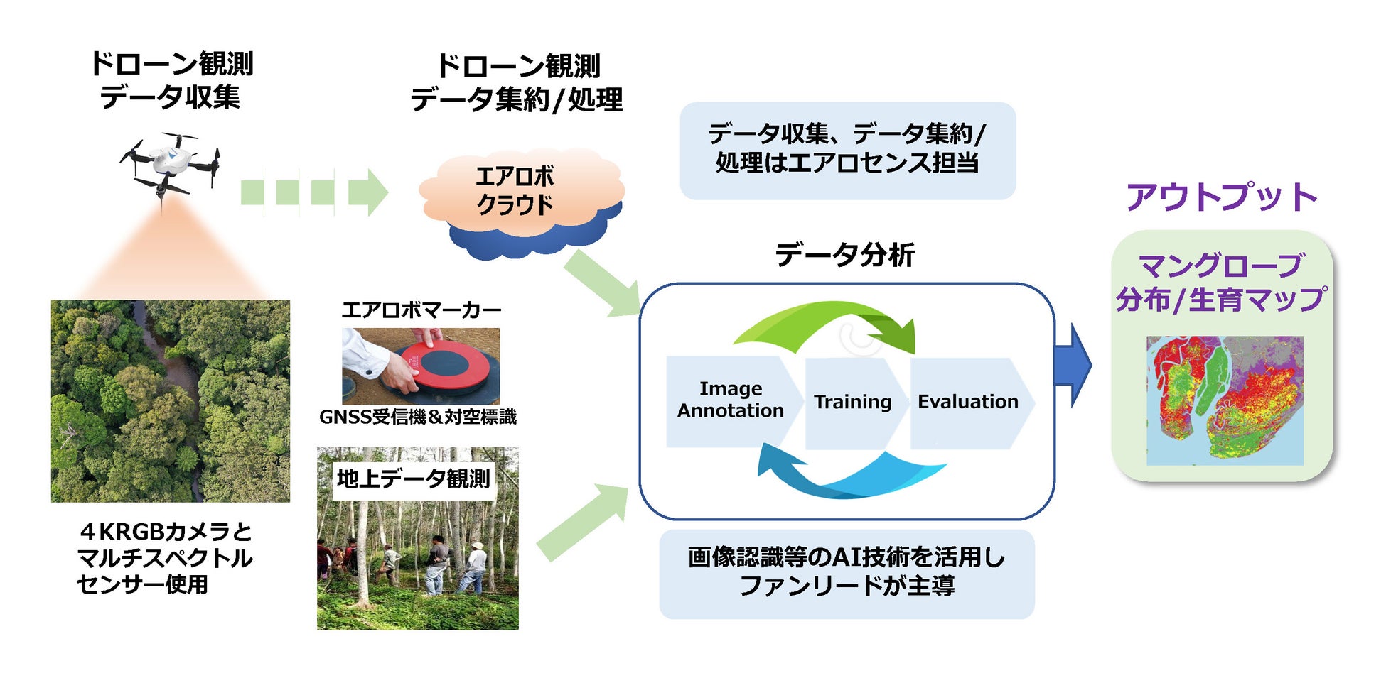 ファンリードは、エアロセンスが収集/処理した空からのデータと地上からのデータを合わせて分析を行うとともに、スマート農業サービスとして培ってきた独自の画像認識などのAI技術を活用し、マングローブの分布/生育マップを作製します。