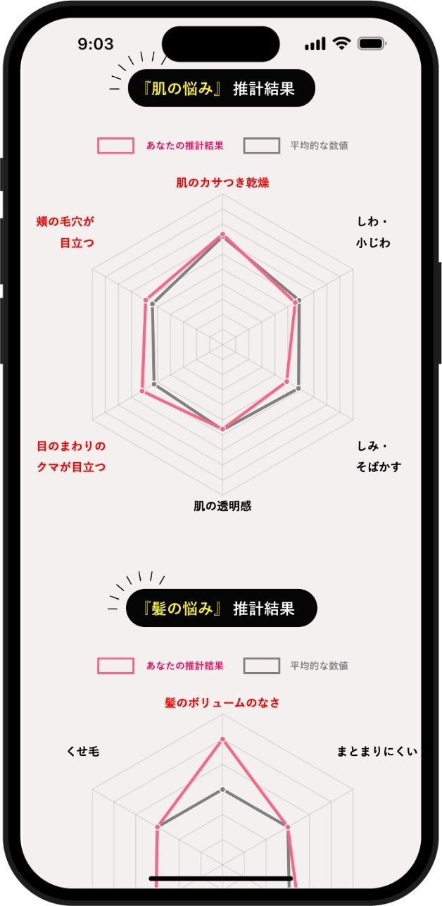『Beauty Chart』は、食事内容、栄養バランス、睡眠の質、運動の頻度などの要素を総合的に評価し、これらの要素と髪や肌の問題との関連性を分析することで、美しく健やかな髪と肌を維持するために必要な情報を提供します。