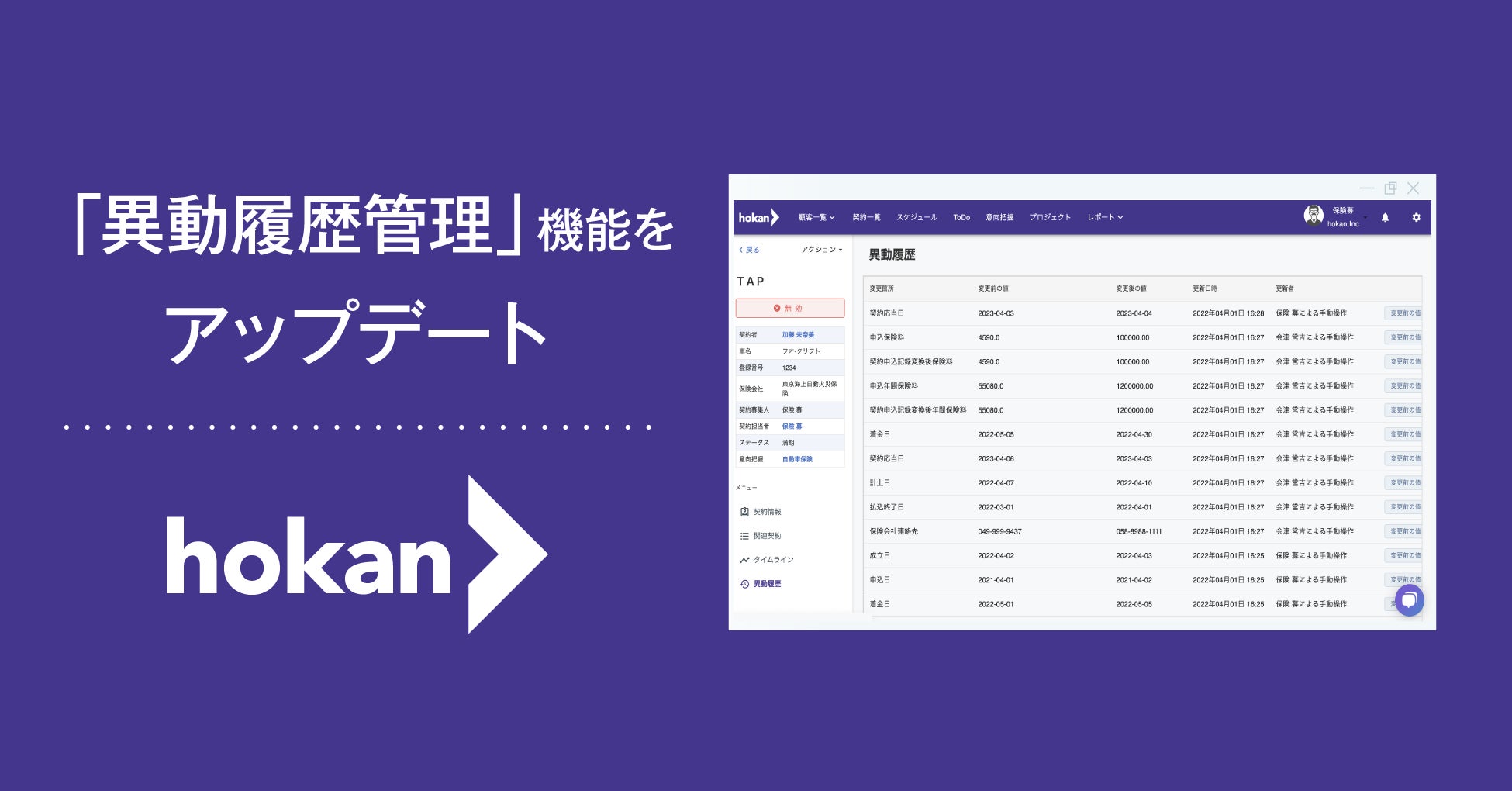 hokanが保険契約の異動に応じた変更管理を自動取得する新機能「異動履歴管理」を公開!
