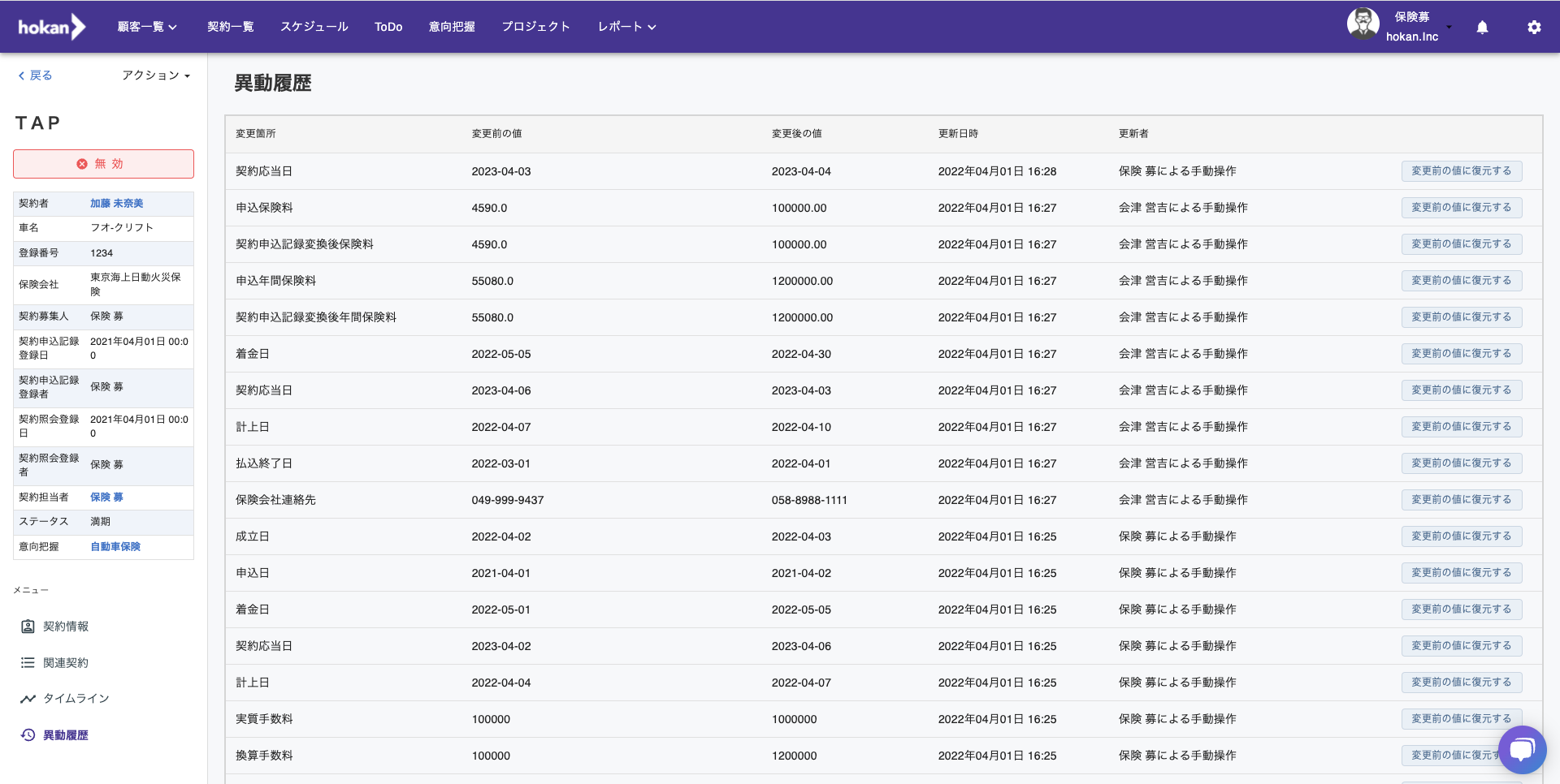 株式会社hokan(本社:東京都千代田区、代表取締役:尾花政篤)が保険代理店に提供する顧客管理システム「hokan®」は、NTTデータ保険会社共同ゲートウェイ経由の契約情報の取得時に、契約の変更内容を自動取得・管理する「異動履歴管理」をリリースいたします。
