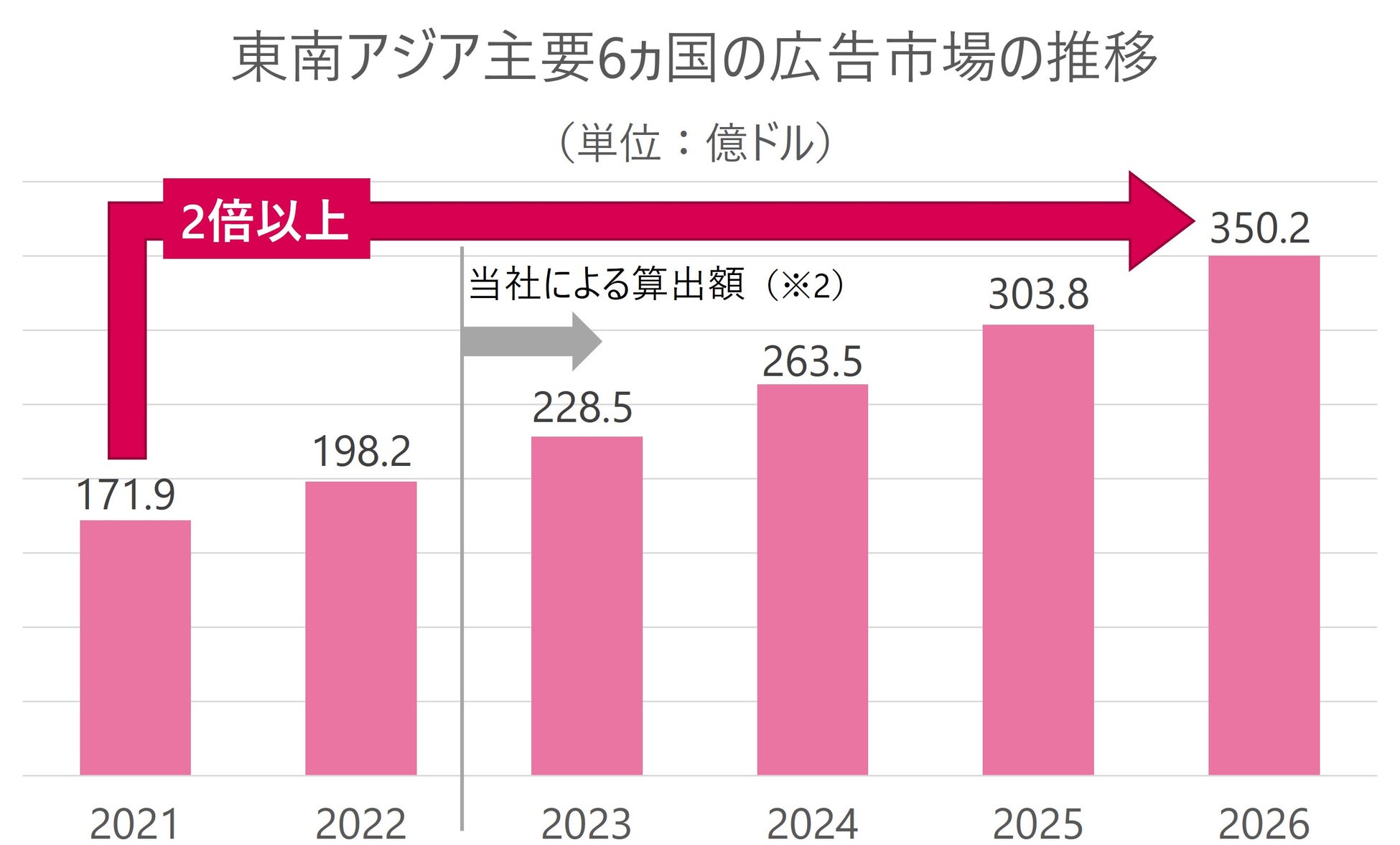※2 市場調査会社スタティスタが発表した「2022年における東南アジア地域の広告市場レポート」及び調査会社モードーインテリジェンスによる「東南アジアの広告市場」の2021年~2026年のおける年平均成長率(CAGR)により広告市場を算出。