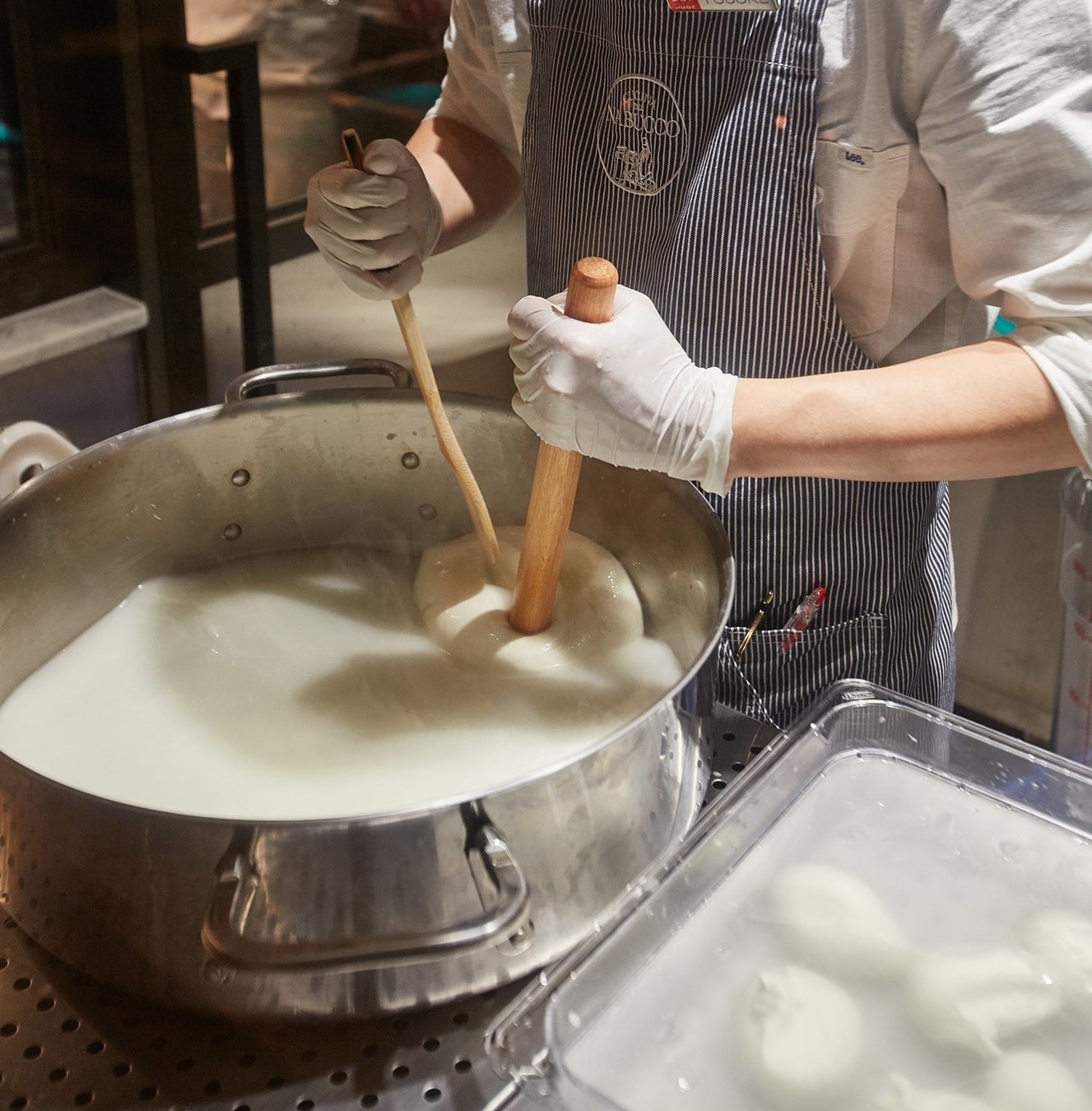 毎朝、チーズ職人が1つ1つ丁寧に作る自家製チーズ。岐阜は飛騨の豊かな自然の中で育った飛騨牛の新鮮な生乳を使用。おいしいチーズを作るために、日々、生乳の鮮度、温度管理を徹底し、“なるべく触らず、やさしく”扱い、チーズのなめらかさな味わいを追求しています。これがcucina del NABUCCOのチーズ作りのこだわりです。