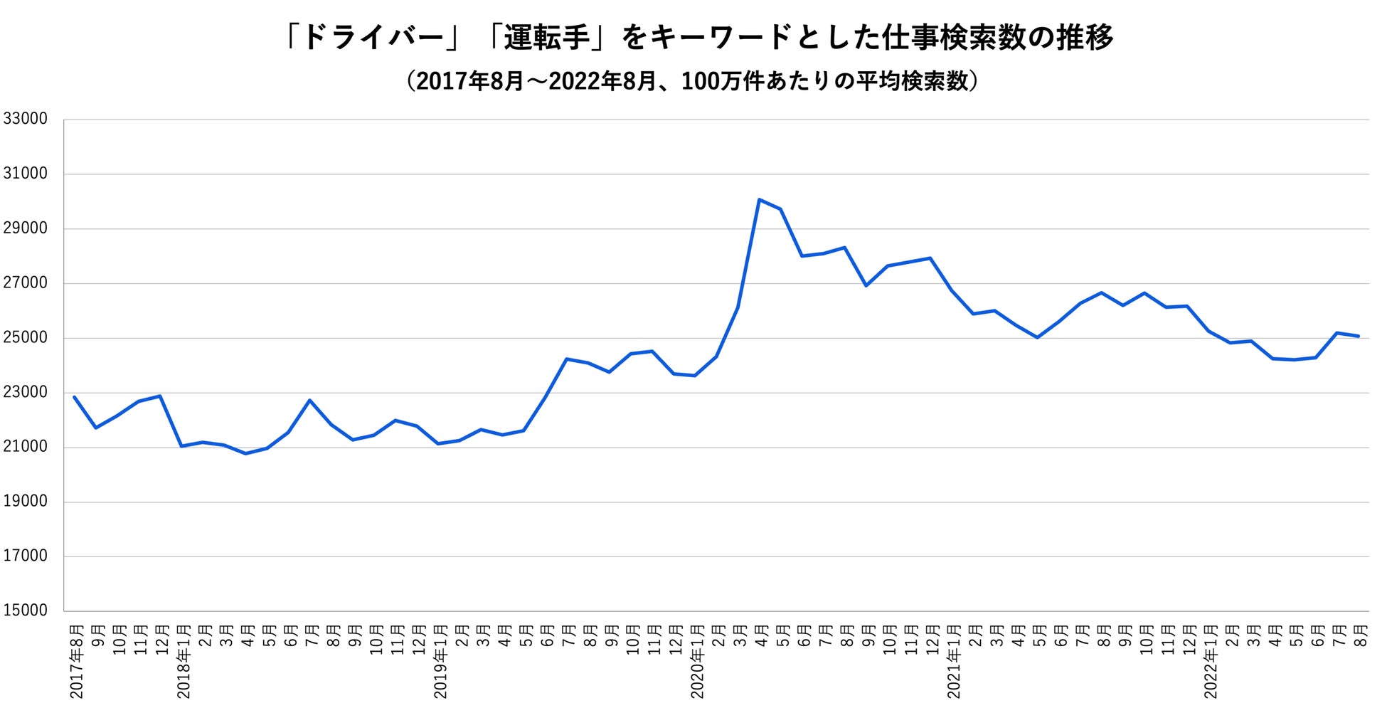 【注】本データは、2017年8月〜2022年8月における仕事検索数100万件あたりの各月の平均推移を示したものであり、実数字ではありません。「ドライバー」「運転手」をキーワードとした検索数を合算し、推移を表したものです。