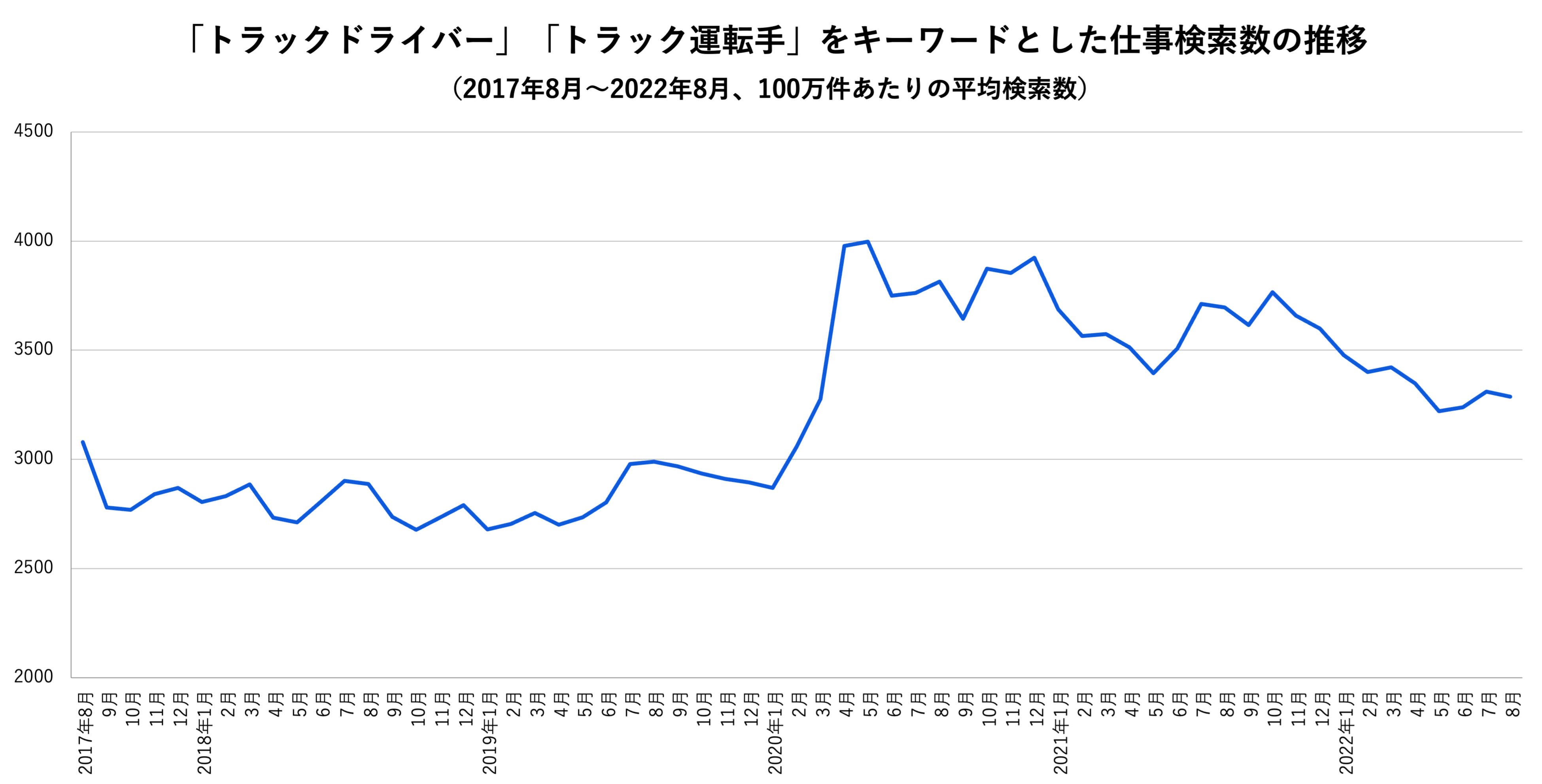 【注】本データは、2017年8月〜2022年8月における仕事検索数100万件あたりの各月の平均推移を示したものであり、実数字ではありません。「トラックドライバー」「トラック運転手」をキーワードとした検索数を合算し、推移を表したものです。