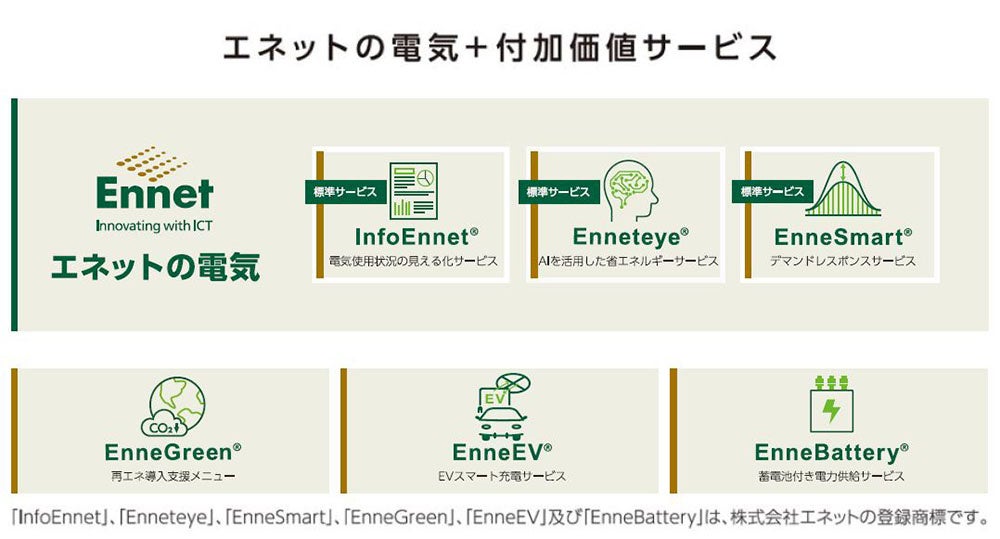 電気使用状況の見える化サービスInfoEnnetをはじめ、お客さまの省エネの取り組みをAIでシンプル・効率的にサポートするEnneteye (2019年度省エネ大賞経済産業大臣賞、2020年度IT賞IT奨励賞を受賞)及び節電要請に応じて節電いただくと電気料金を割引するデマンドレスポンスサービスEnneSmartを標準サービスとして提供しています。