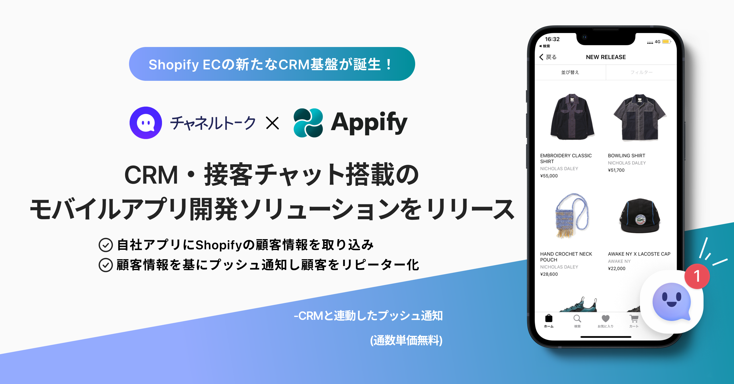 熱狂的ファンを作るAll-in-one接客・CRMチャット「チャネルトーク」(株式会社Channel Corporation、所在地:東京都新宿区、CCO:坂本彩、以下「チャネルトーク」)は、ノーコードアプリ開発プラットフォームの「Appify(アッピファイ)」を運営する株式会社Appify Technologies(本社:東京都港区 代表取締役:福田 涼介)と技術提携を締結し、Shopifyで構築した自社ECの「LTVを向上」させるための、接客チャット・CRM搭載モバイルアプリ開発ソリューションをリリースいたします。