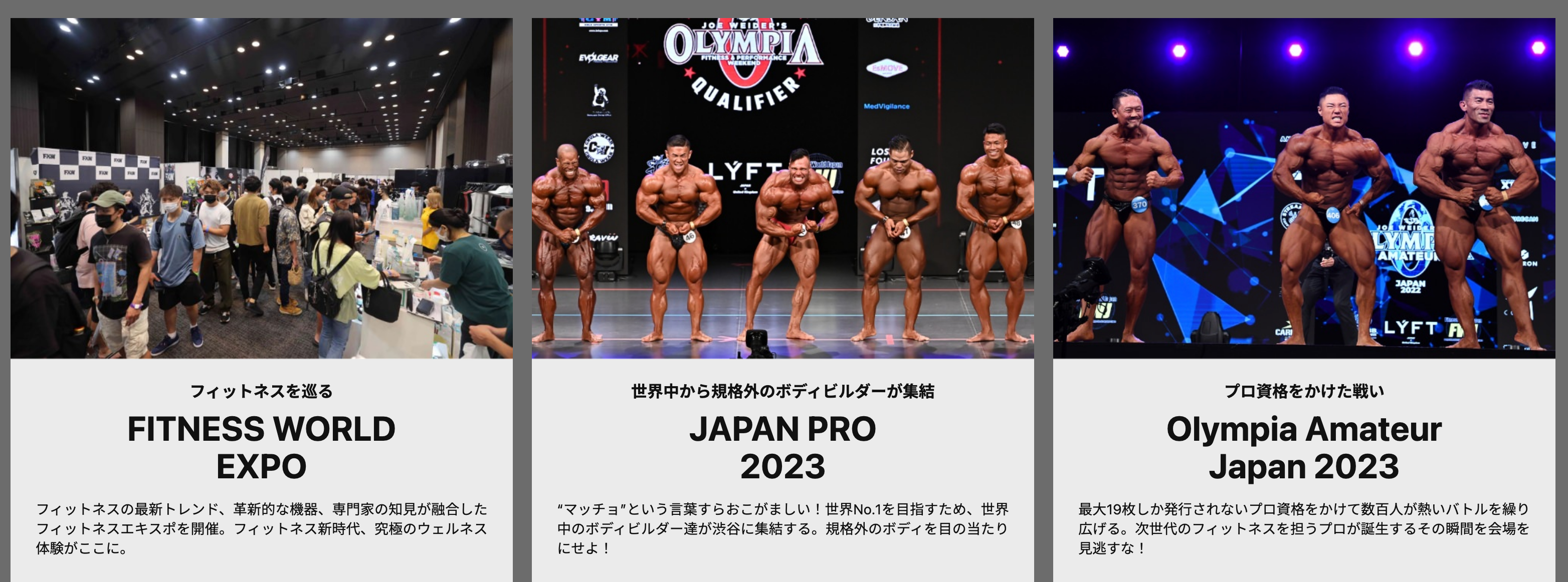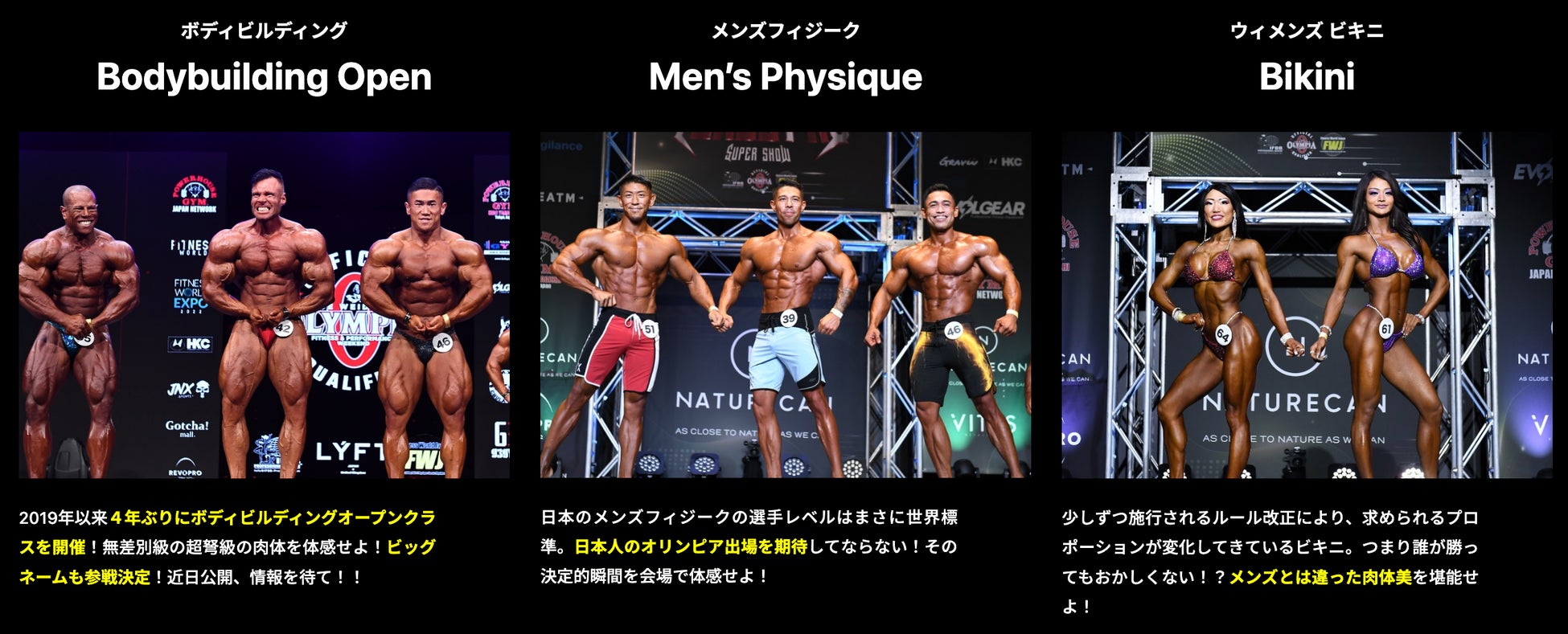 アマチュアからプロまで、ボディビル、フィジーク、ビキニを始めとした、
