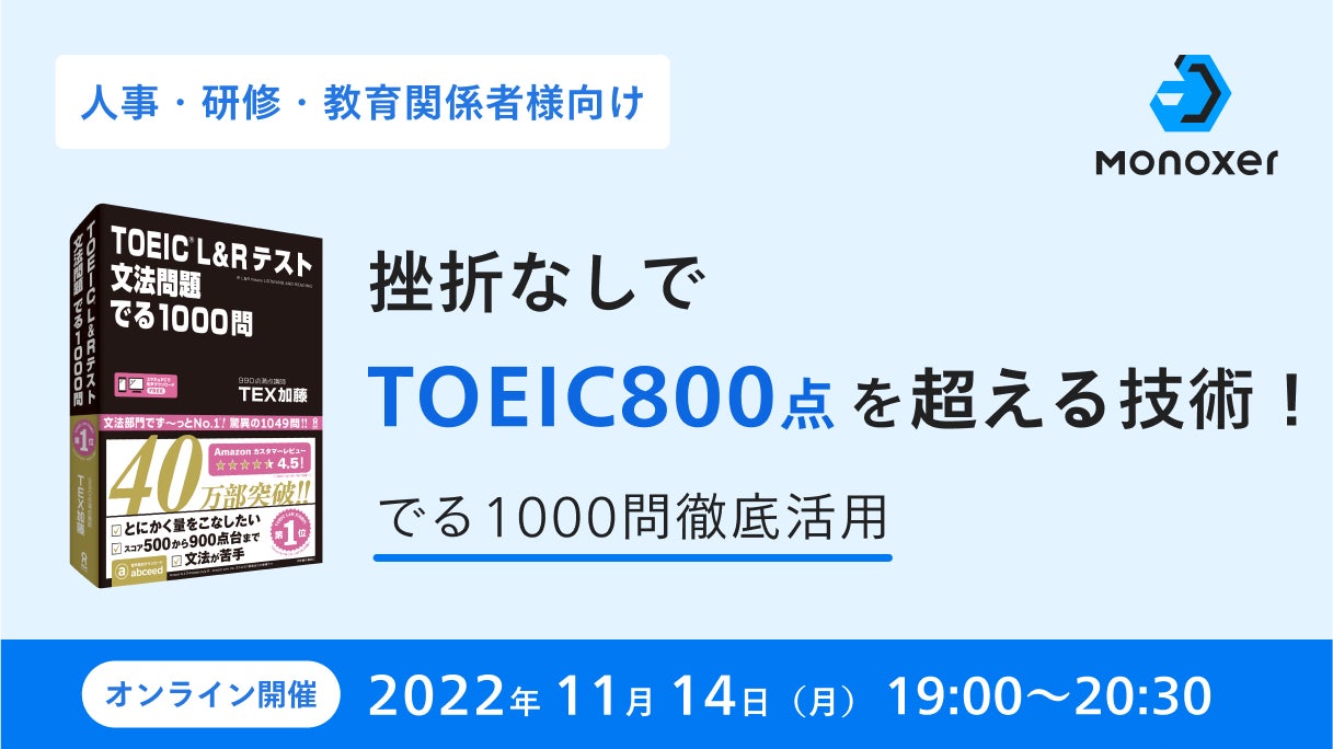 Monoxer上での試験提供開始を記念して、11月14日(月)19時より『挫折なしでTOEIC800点を超える技術!でる1000問徹底活用』をテーマとしたWEBセミナーを開催します。