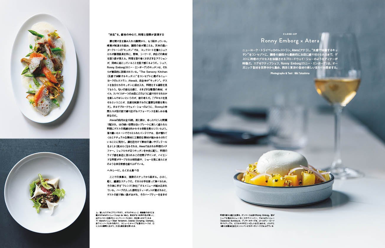ニューヨーク・トライベッカのレストラン、Atera(アテラ)。“五感で体験するキッチン”をコンセプトに、調理の過程から最終的にお皿に盛り付けられるまで、ゲストに料理のプロセスを体験させるブロードウェイ・ショーのようなディナーが特徴です。エグゼクティブシェフ、Ronny Emborg(ロニー・エンボーグ)は、オーガニック食材を世界中から集め、西洋と東洋の食材の新しい交わりを探求しています。