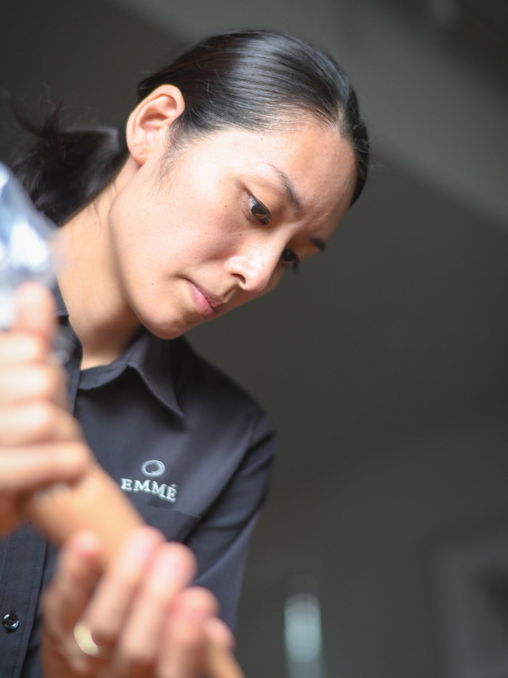 1987年、京都生まれ。パリ〈フレデリック・カッセル〉で研修、東京の有名パティスリーでの修業、〈ツキ シュール・ラ・メール〉やミシュラン1つ星〈ラチュレ〉のシェフパティシエを経て、2019年9月、夫でソムリエの延命寺信一とEMMEをオープン。2023年にはゴエミヨベストパティシエ賞を受賞。