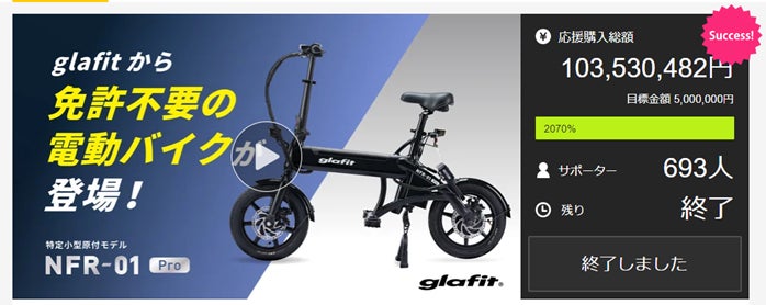 Makuakeの電動モビリティプロジェクトで、3連続で1億円を超える応援購入金額を達成したのは、glafitが初めてとなります。また、特定原付のプロジェクトで初めての1億円越えを達成しました。