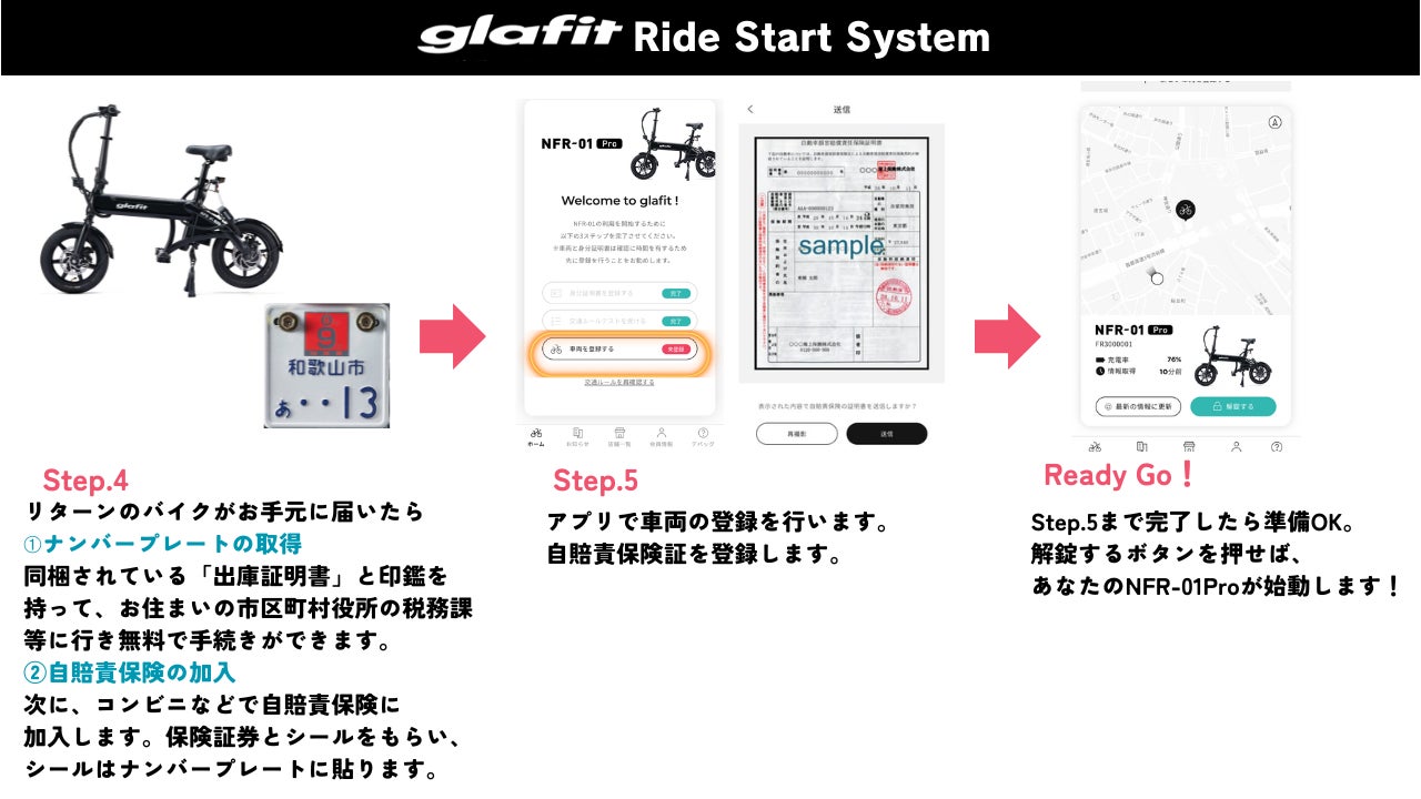 glafitでは、性能等確認適合(JATA-0062)車両をお届けするとともに、交通ルールテストへの合格、年齢確認やナンバー取得、自賠責保険加入の確認ができないと車両の電源が入らないRide Start System(ライドスタートシステム)を独自で開発しています。